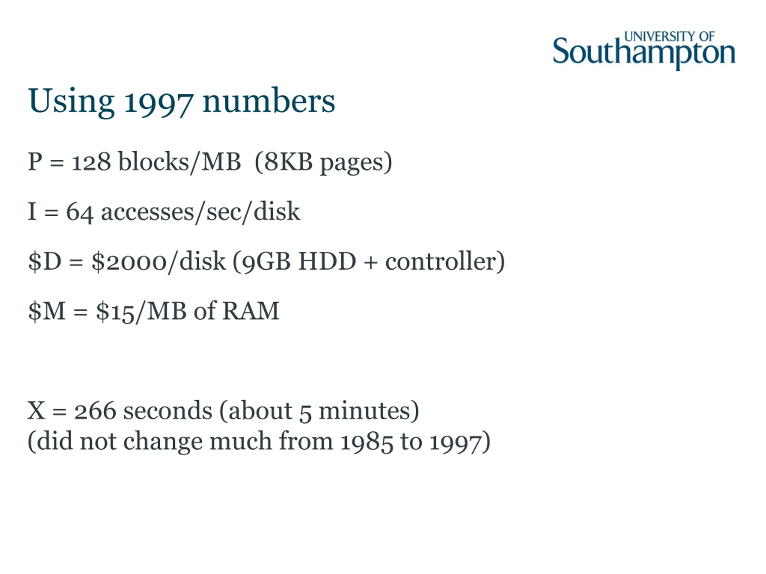 Using 1997 numbers P = 128 blocks/MB (8KB pages) I = 64 accesses/sec/disk $D = $2000/disk (9GB HDD + controller) $M = $15/MB of RAM X = 266 seconds (about 5 minutes) (did not change much from 1985 to 1997)