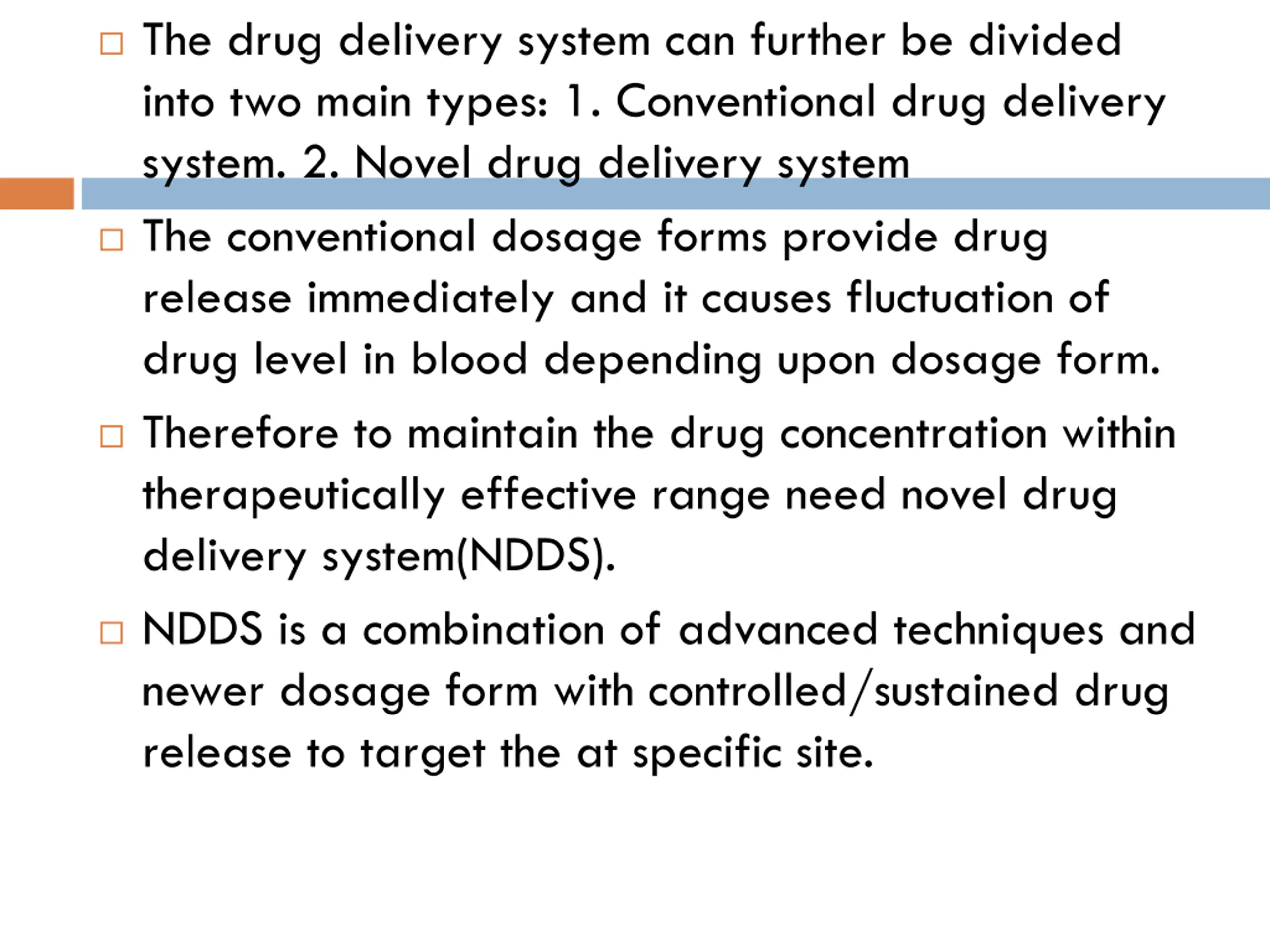 The drug delivery system can further be divided into two main types: 1. Conventional drug delivery system. 2. Novel drug delivery system The conventional dosage forms provide drug release immediately and it causes fluctuation of drug level in blood depending upon dosage form. Therefore to maintain the drug concentration within therapeutically effective range need novel drug delivery system(NDDS). NDDS is a combination of advanced techniques and newer dosage form with controlled/sustained drug release to target the at specific site.