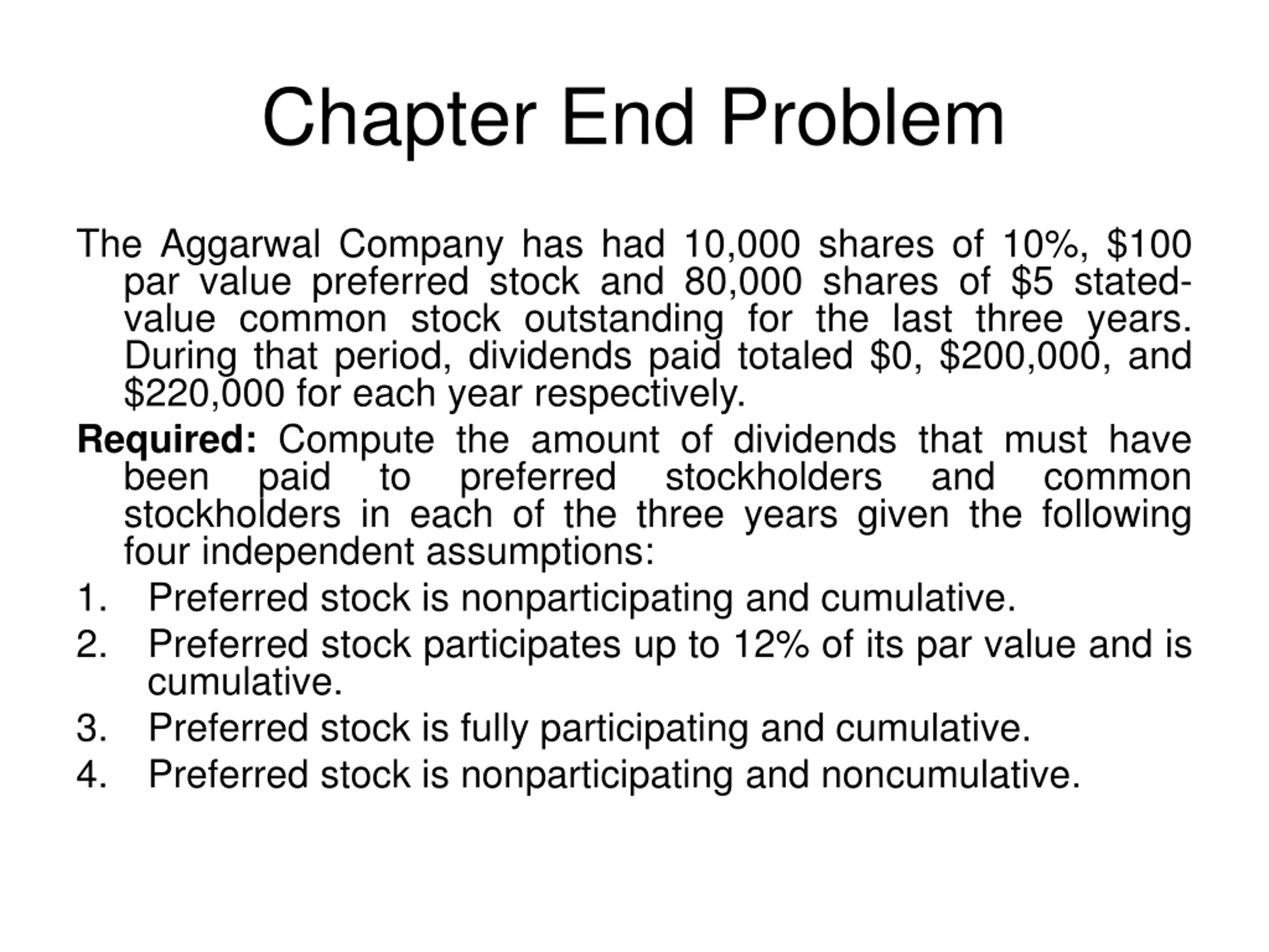 Chapter End Problem The Aggarwal Company has had 10,000 shares of 10%, $100 par value preferred stock and 80,000 shares of $5 stated- value common stock outstanding for the last three years. During that period, dividends paid totaled $0, $200,000, and $220,000 for each year respectively. Required: Compute the amount of dividends that must have been paid to preferred stockholders in each of the three years given the following four independent assumptions: 1. Preferred stock is nonparticipating and cumulative. 2. Preferred stock participates up to 12% of its par value and is cumulative. 3. Preferred stock is fully participating and cumulative. 4. Preferred stock is nonparticipating and noncumulative. stockholders and common