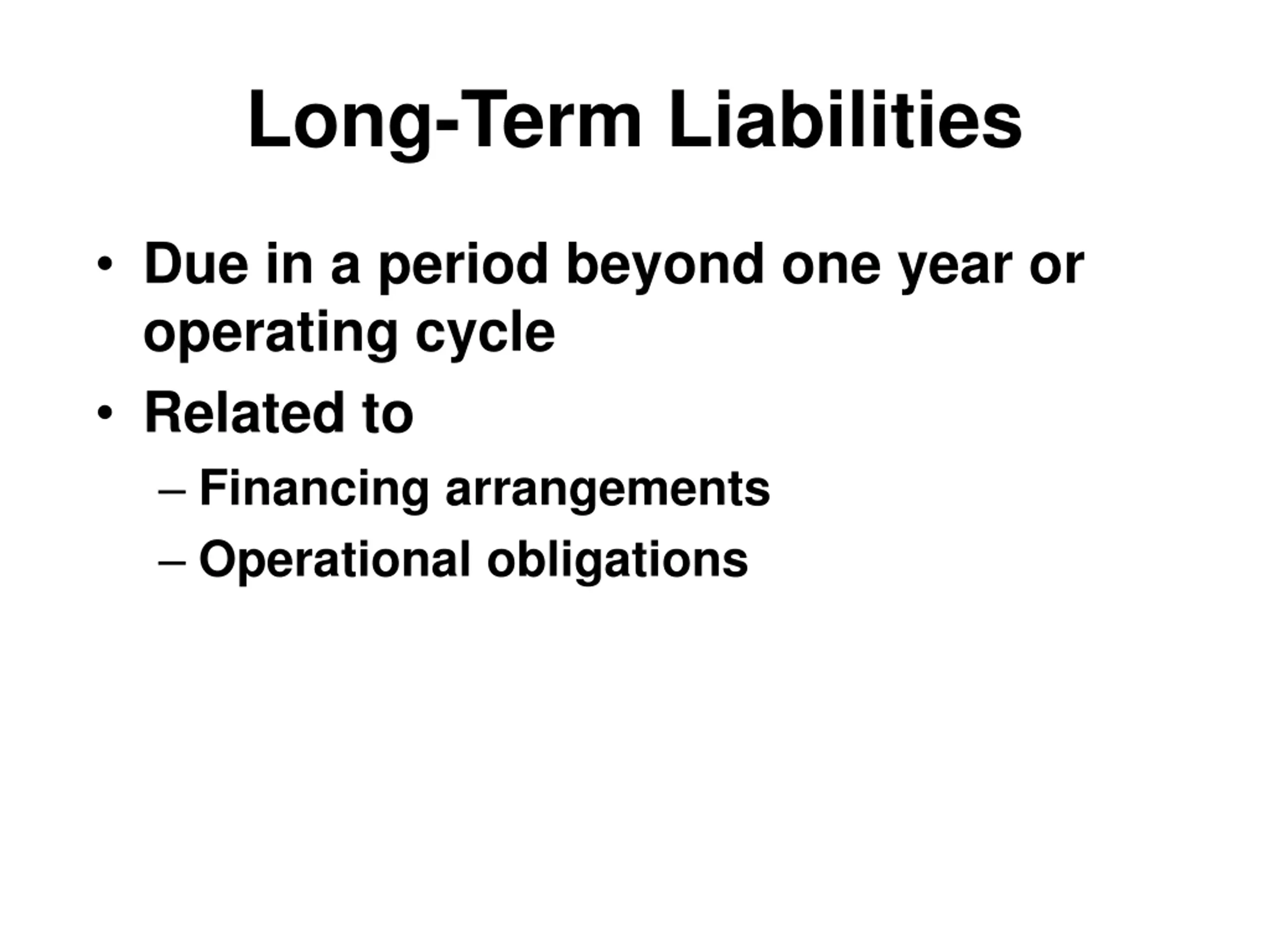 Long-Term Liabilities: Operational Obligations (cont d) Minority Interest Reported on consolidated financial statements Represents the interest in the equity of a partially-held subsidiary by the non majority owners Not a liabilitybut for purposes of analysis treat as a liability Other Noncurrent Liabilities As circumstances warrant Redeemable Preferred Stock Excluded from stockholders equity For analysis, treat as a liability