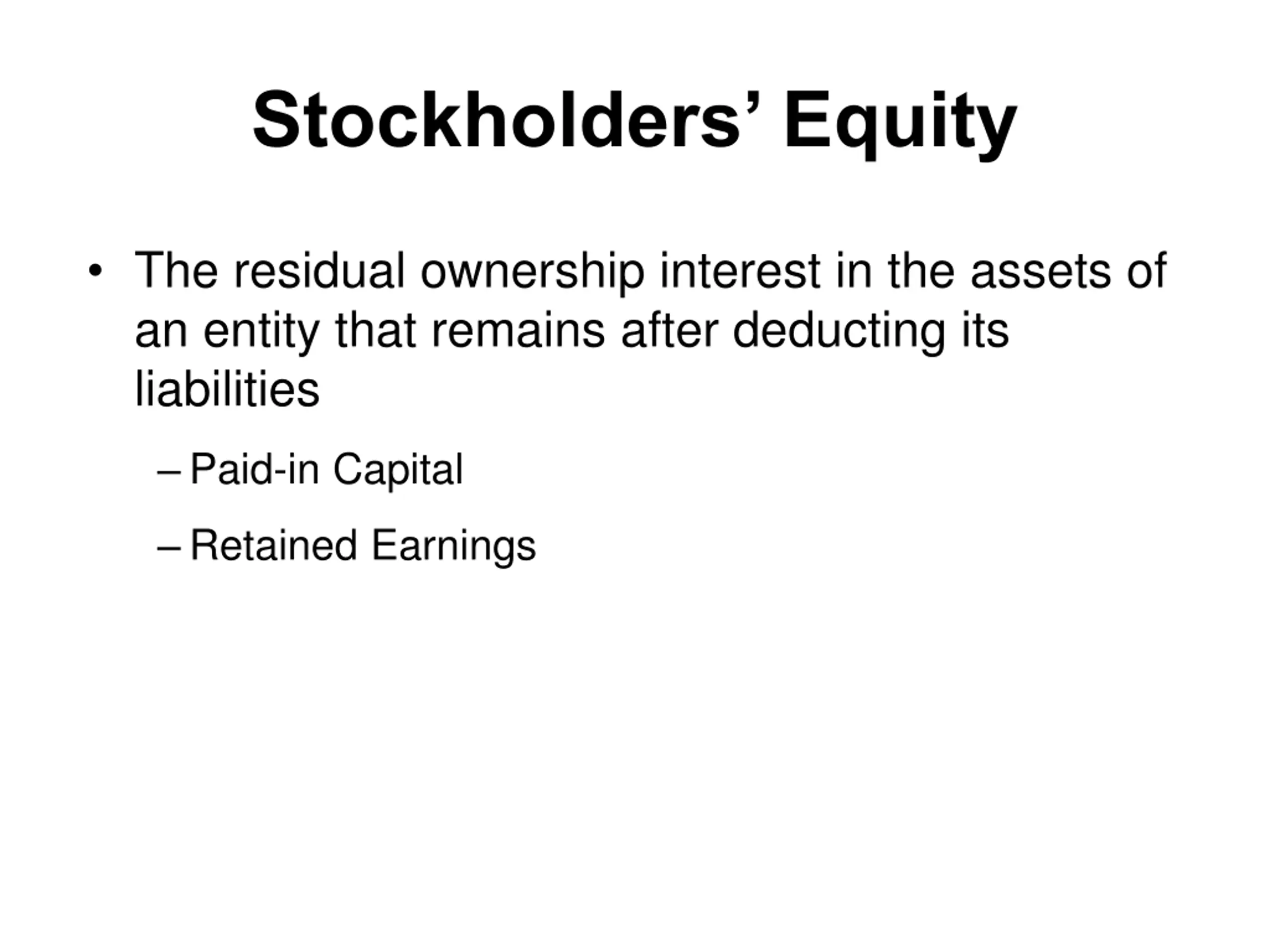 Stockholders Equity The residual ownership interest in the assets of an entity that remains after deducting its liabilities Paid-in Capital Retained Earnings