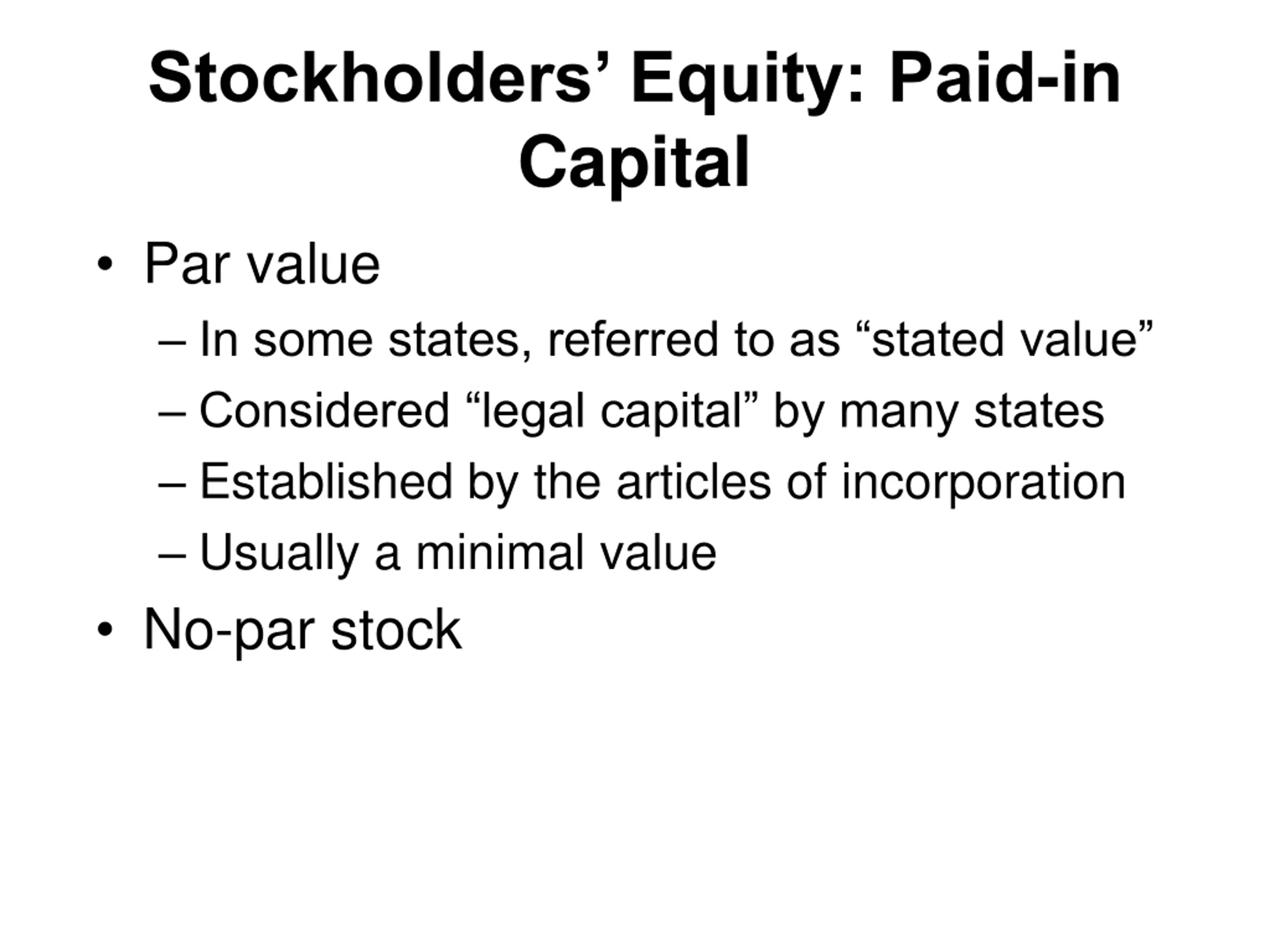 Stockholders Equity: Paid-in Capital Par value In some states, referred to as stated value Considered legal capital by many states Established by the articles of incorporation Usually a minimal value No-par stock