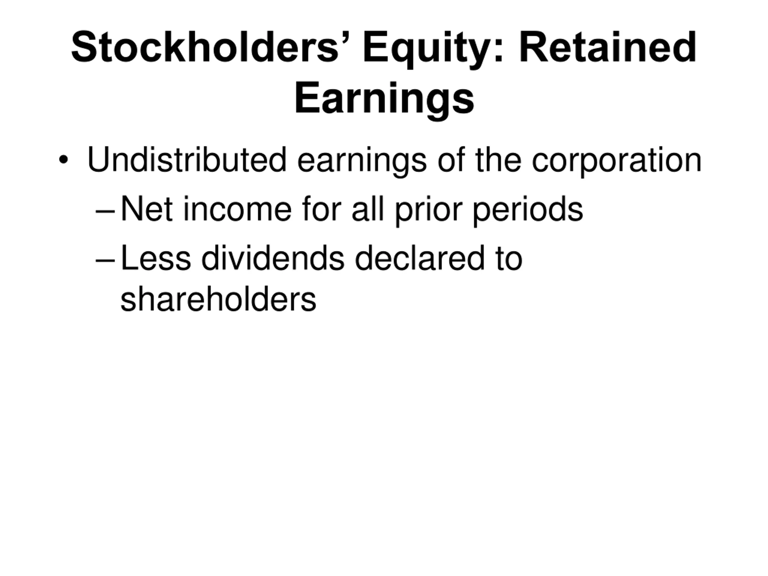Stockholders Equity: Paid-in Capital (cont d) Preferred Stock Does not normally convey voting rights May carry any or all of these features: Preference as to dividends Accumulation of dividends Participation in dividend beyond stated dividend rate Convertibility into common stock at holder s discretion Preference in liquidation secondary to creditors Callable at issuer discretion Redemption at future maturity value Donated Capital Donated by outside entities Shareholder surrender of stock