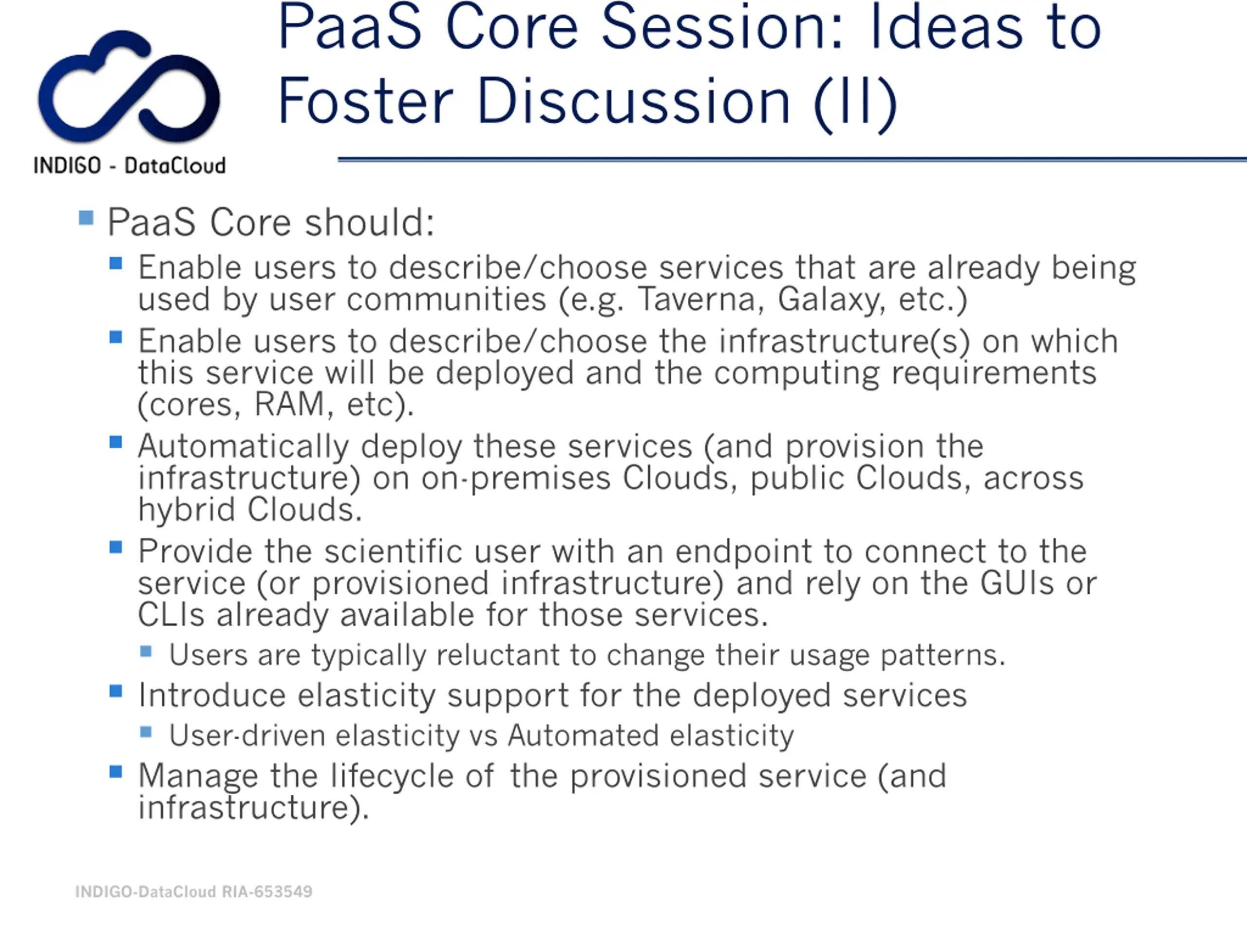 PaaS Core Session: Ideas to Foster Discussion (IV) Therefore, PaaS Core should focus: On the definition of e-science services that address the requirements of user communities. On the definition of computational infrastructures on which to deploy those services And provide: Automated deployment of those services to those infrastructures Lifecycle and elasticity management of (the infrastructure allocated for) those services. This will: Enable to iteratively introduce support for different services and different infrastructures. INDIGO-DataCloud RIA-653549