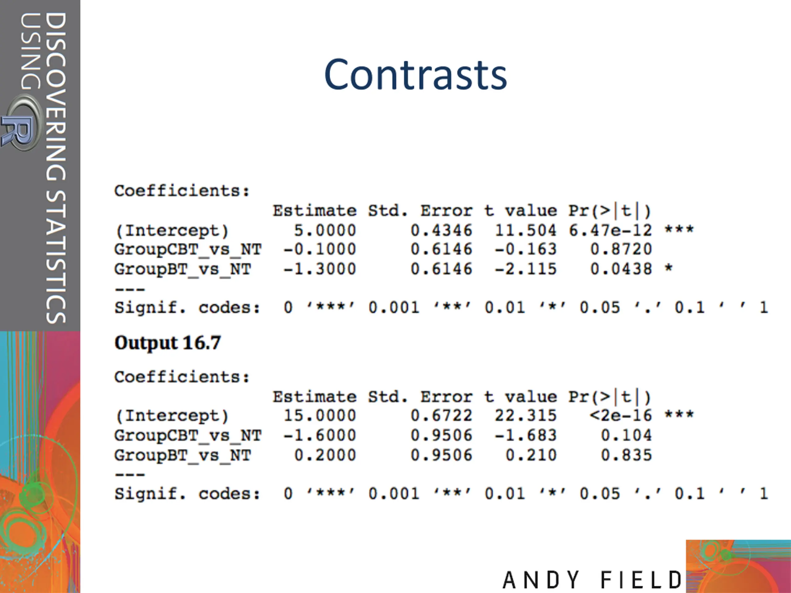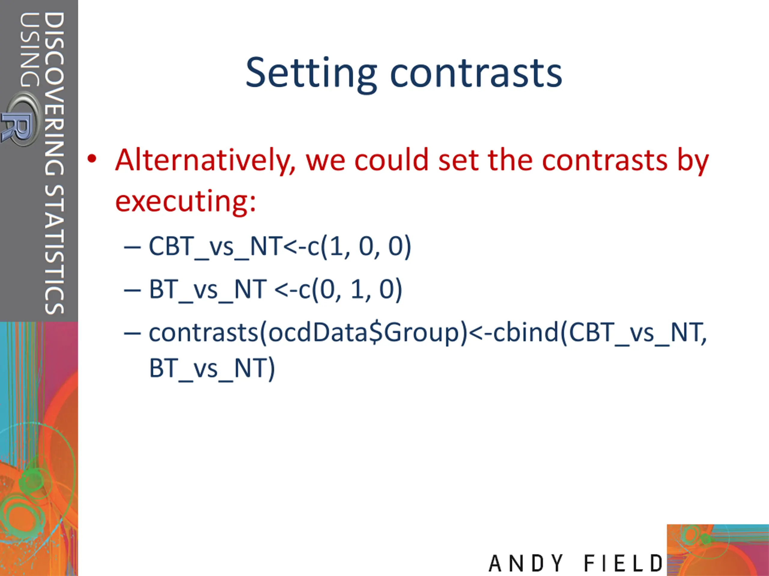 Setting contrasts Alternatively, we could set the contrasts by executing: CBT_vs_NT<-c(1, 0, 0) BT_vs_NT <-c(0, 1, 0) contrasts(ocdData$Group)<-cbind(CBT_vs_NT, BT_vs_NT)