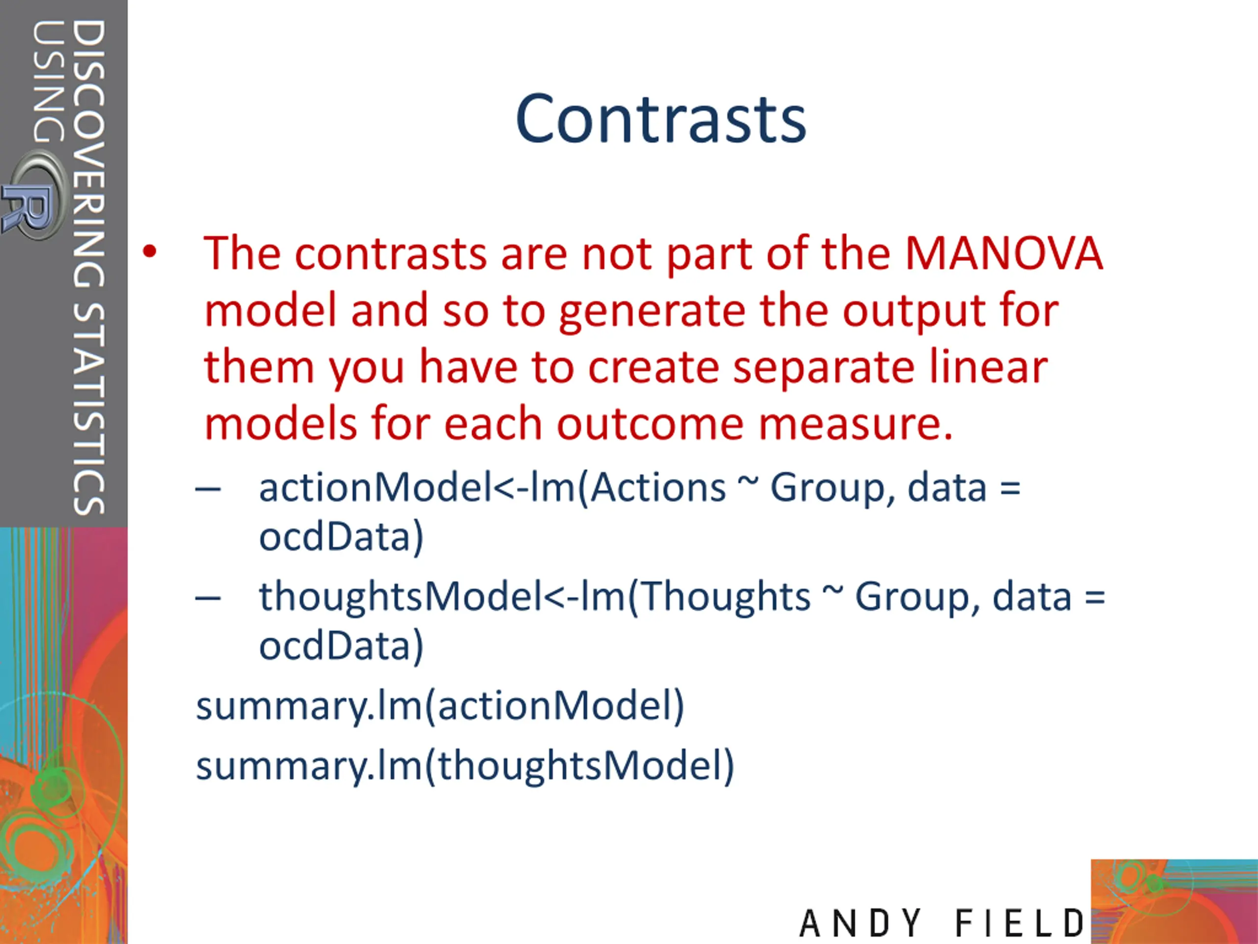 Contrasts The contrasts are not part of the MANOVA model and so to generate the output for them you have to create separate linear models for each outcome measure. actionModel<-lm(Actions ~ Group, data = ocdData) thoughtsModel<-lm(Thoughts ~ Group, data = ocdData) summary.lm(actionModel) summary.lm(thoughtsModel)