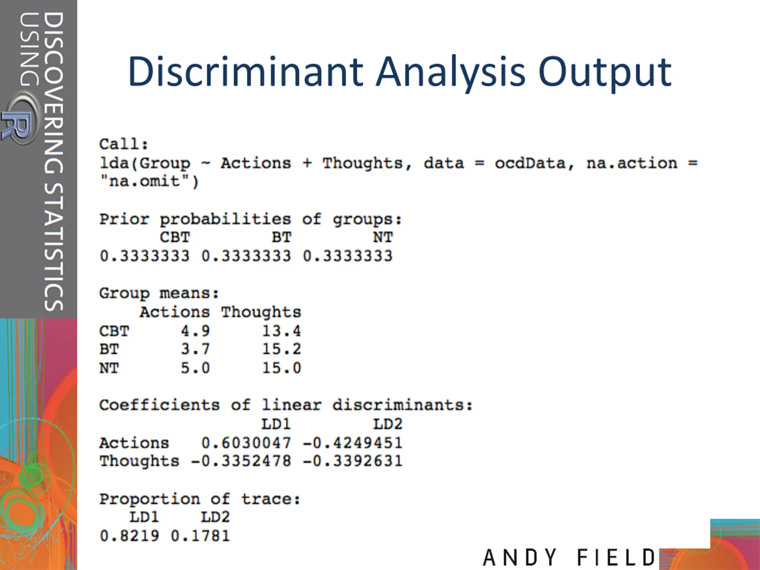 Following MANOVA with Discriminant Function Analysis Discriminant analysis is quite straightforward in R: you use the lda() function from the MASS package. The basic format of this function is: newModel<-lda(Group ~ Predictor(s), data = dataFrame, prior = prior probabilities, na.action = "na.omit") For the current data, we could, therefore, execute: ocdDFA<-lda(Group ~ Actions + Thoughts, data = ocdData) ocdDFA Slide 36