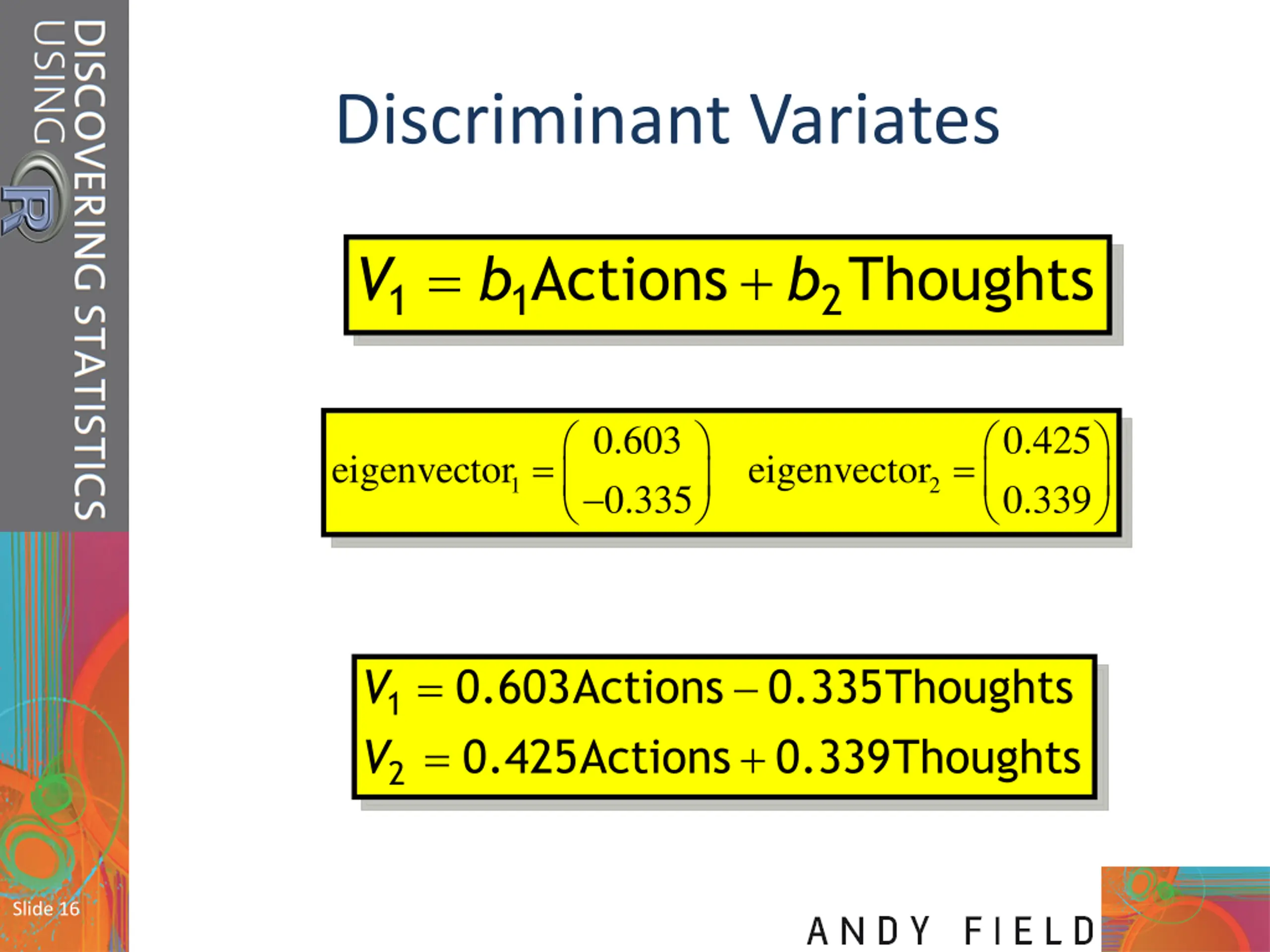 Discriminant Variates = + V Actions 1 b b Thoughts 1 2 0.603 0.335 0.425 0.339 = = eigenvector eigenvector 1 2 = V . 0 = 603 Actions . 0 + 335 Thoughts 1 V . 0 425 Actions . 0 339 Thoughts 2 Slide 16