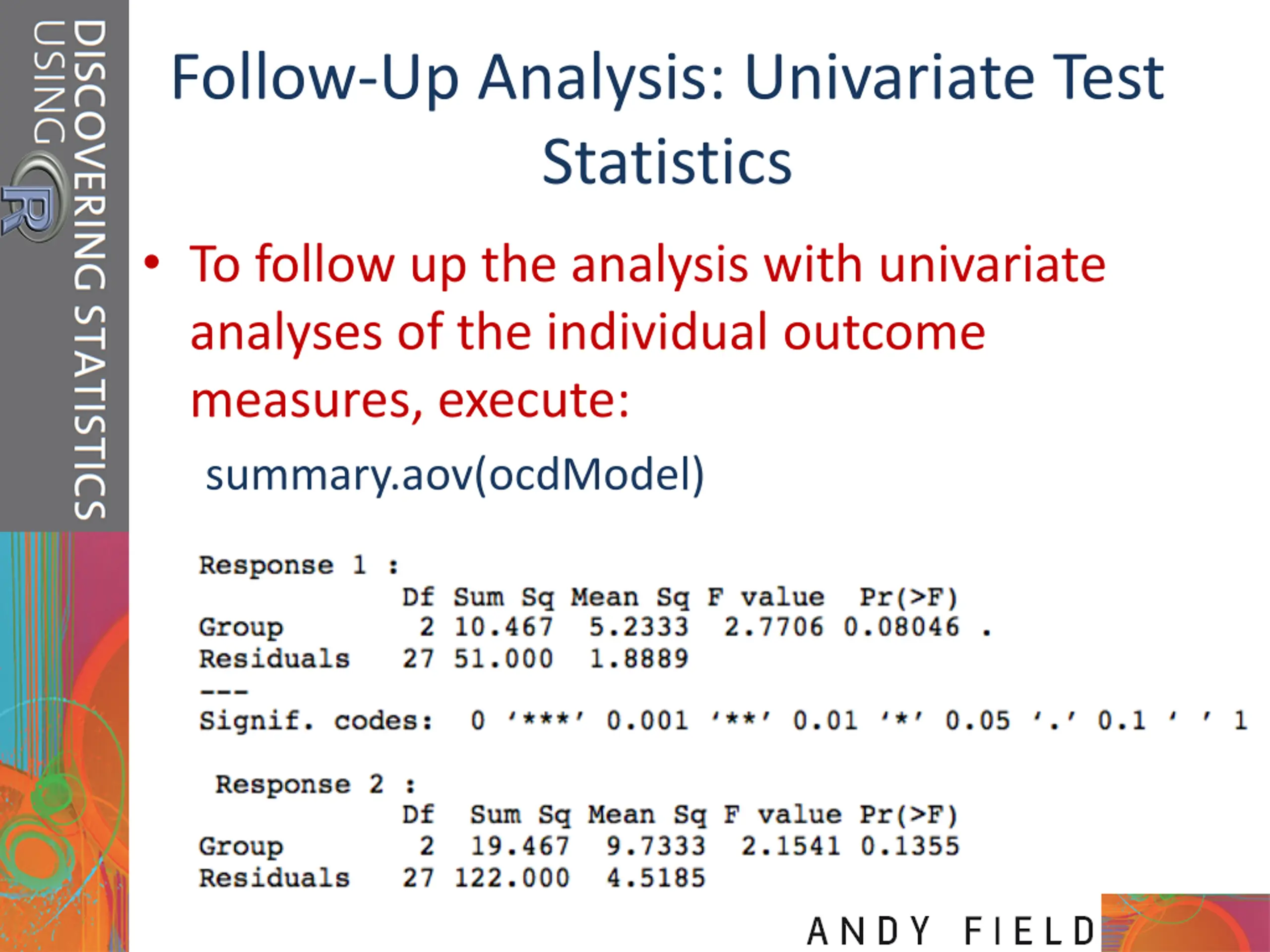 Follow-Up Analysis: Univariate Test Statistics To follow up the analysis with univariate analyses of the individual outcome measures, execute: summary.aov(ocdModel)