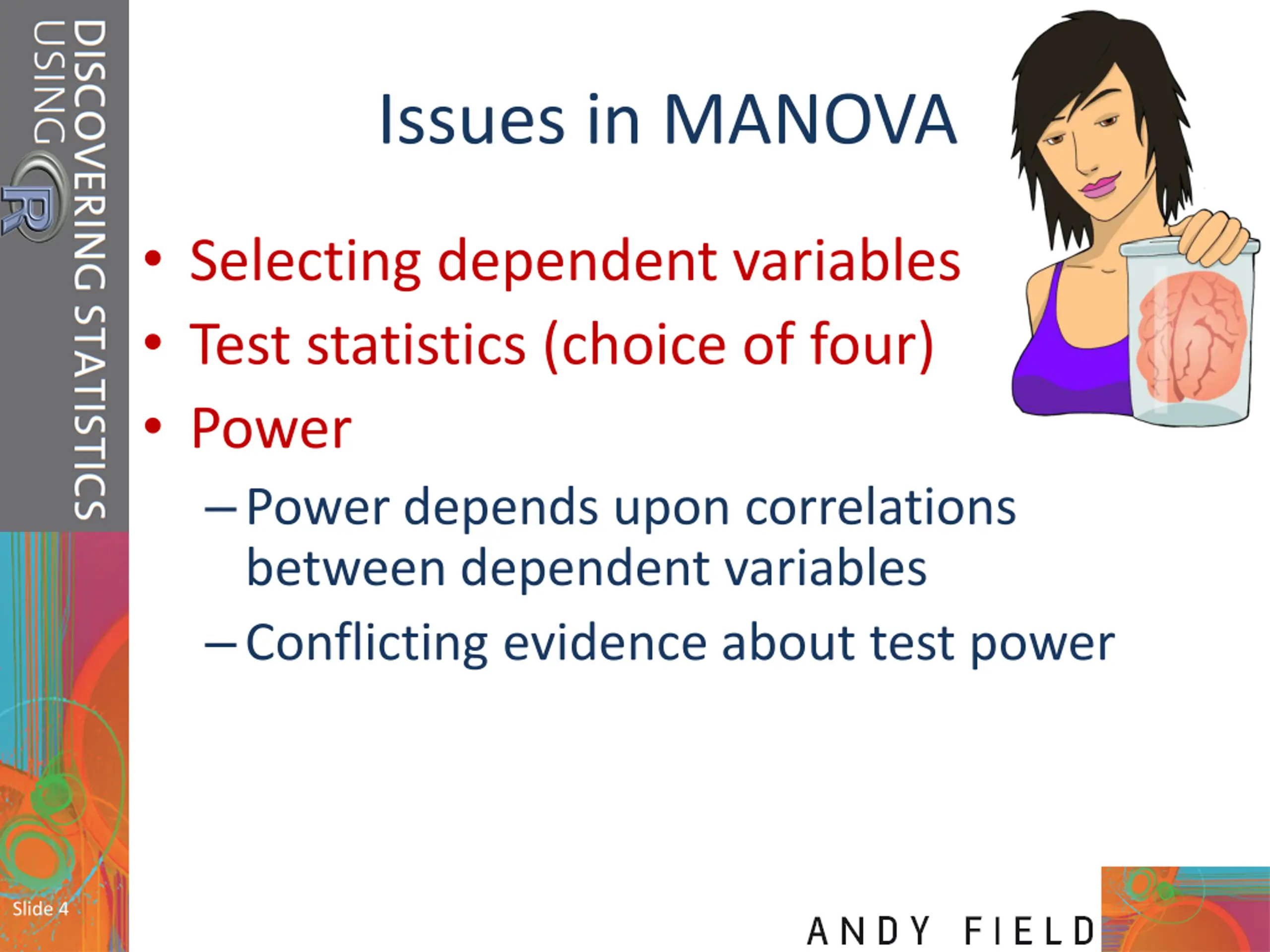 Issues in MANOVA Selecting dependent variables Test statistics (choice of four) Power Power depends upon correlations between dependent variables Conflicting evidence about test power Slide 4