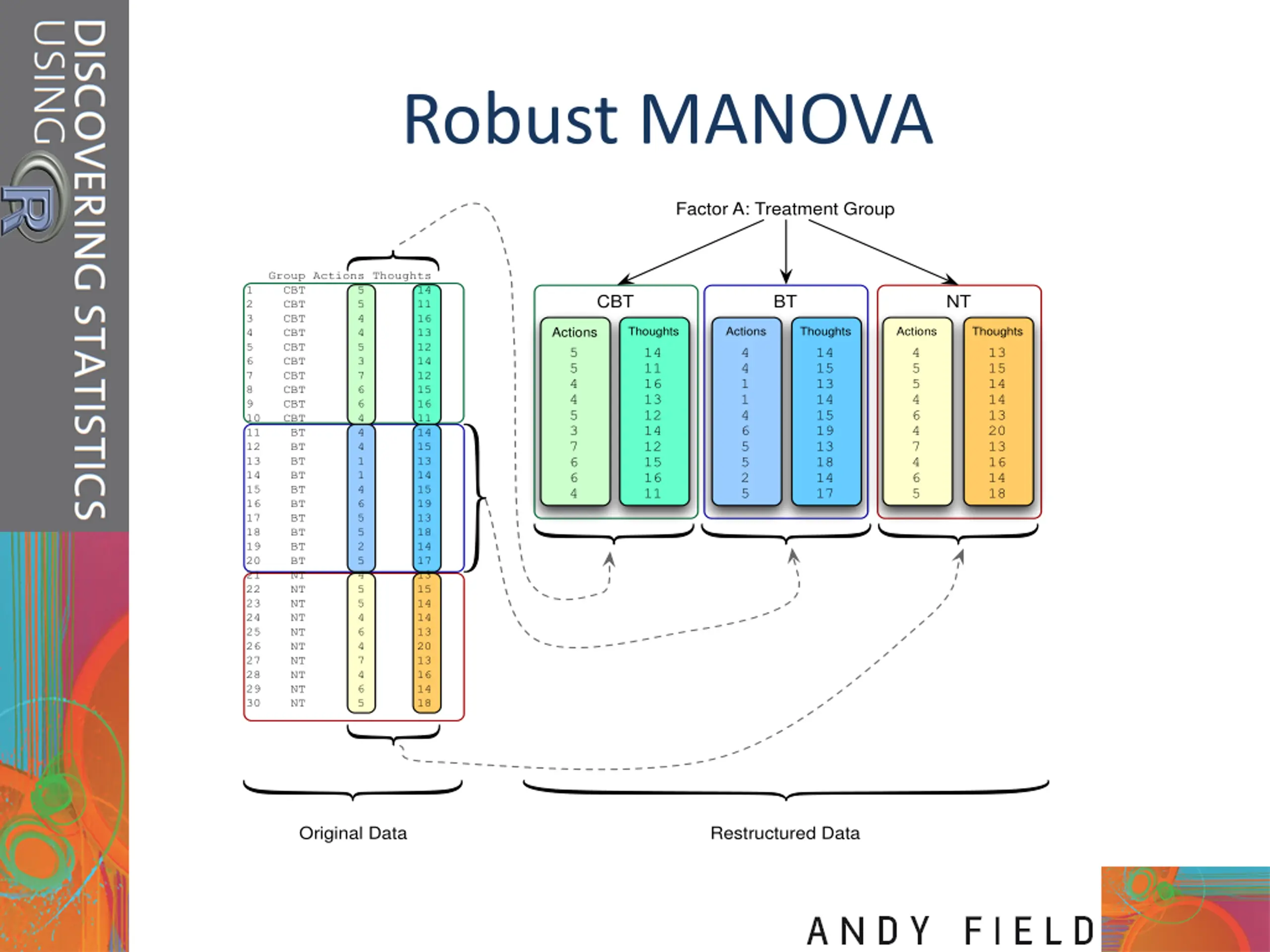 Robust MANOVA ocdData$row<-rep(1:10, 3) ocdMelt<-melt(ocdData, id = c("Group", "row"), measured = c("Actions", "Thoughts")) names(ocdMelt)<-c("Group", "row", "Outcome_Measure", "Frequency") ocdRobust<-cast(ocdMelt, row ~ Group + Outcome_Measure, value = "Frequency") ocdRobust$row<-NULL ocdRobust