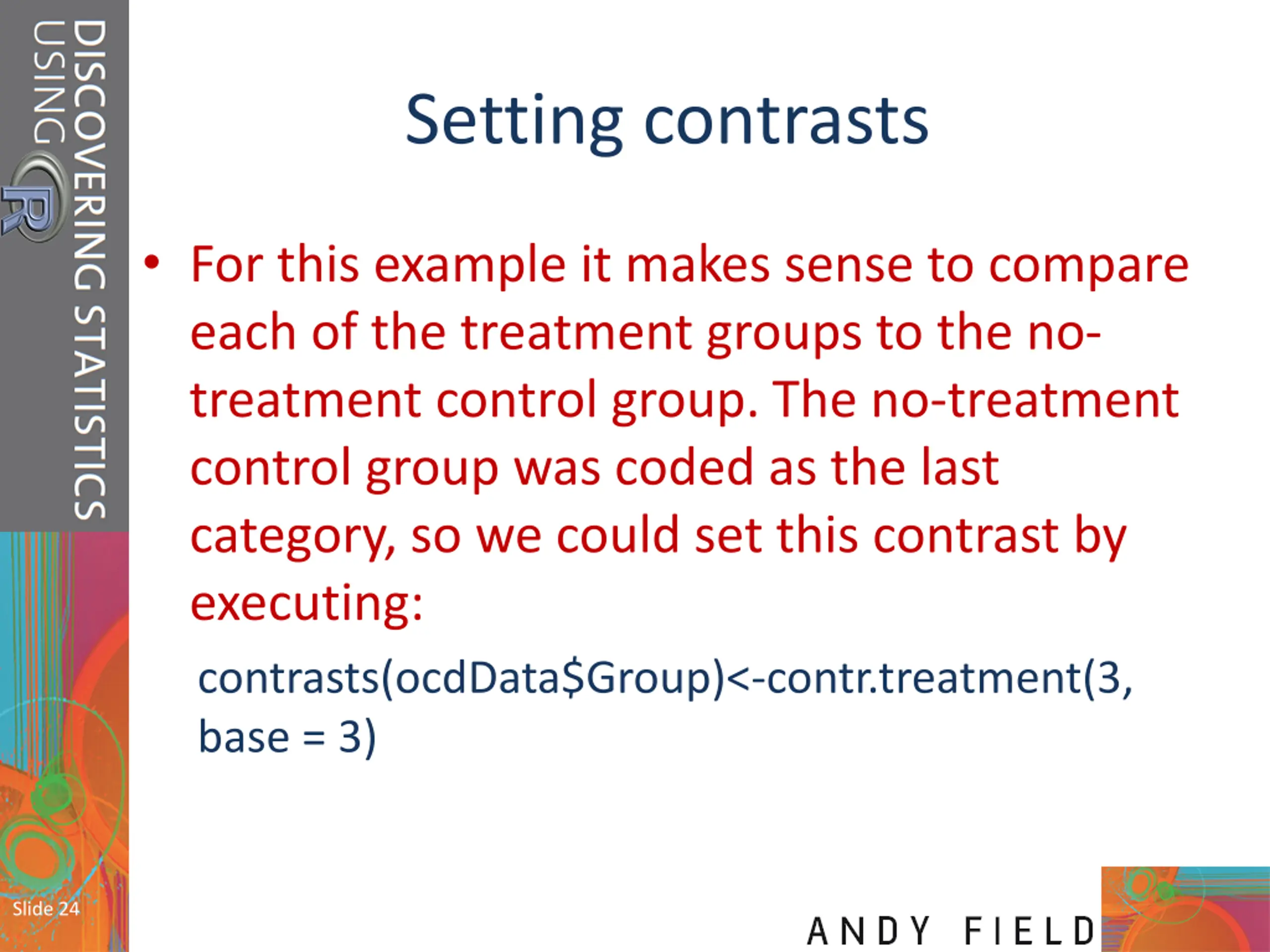 Setting contrasts For this example it makes sense to compare each of the treatment groups to the no- treatment control group. The no-treatment control group was coded as the last category, so we could set this contrast by executing: contrasts(ocdData$Group)<-contr.treatment(3, base = 3) Slide 24