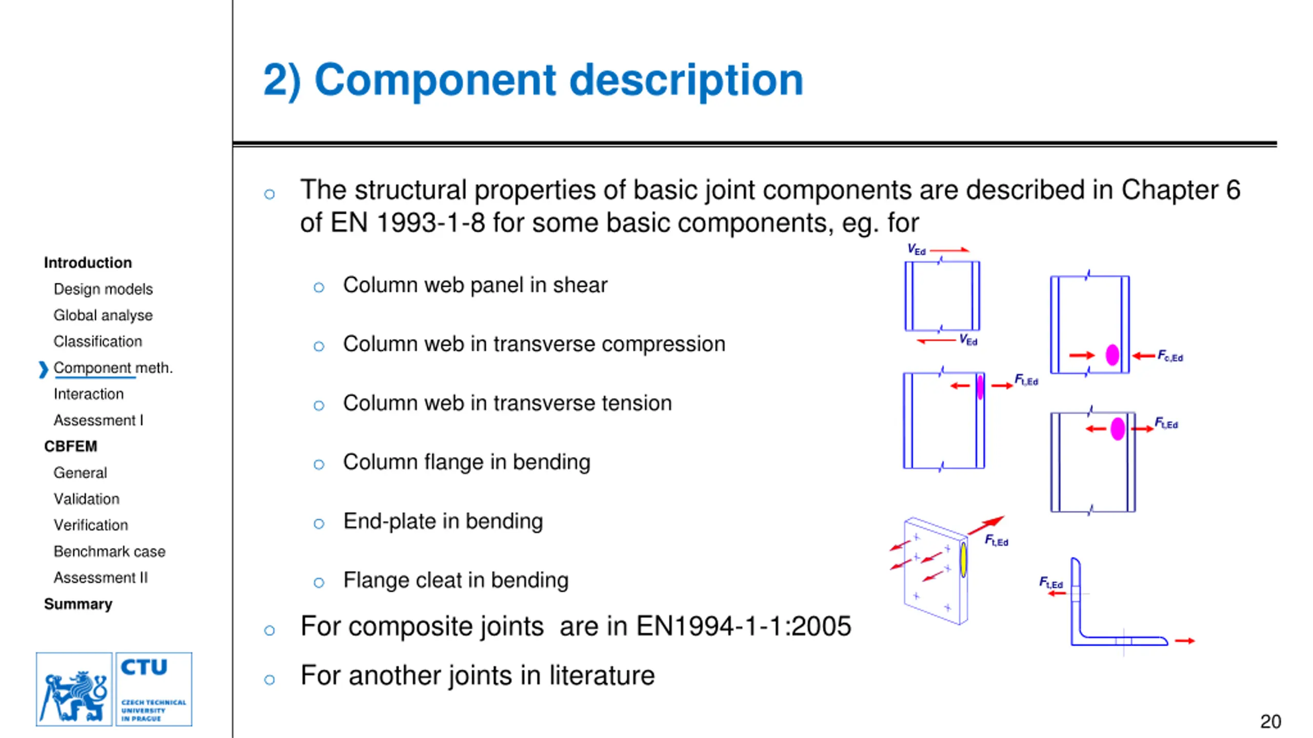 1) Decomposition of joint o In simplified procedures are joints design in one plane o Joint is decomposet to component based on best engineering practice o Example below is decomposition of the beam to column joint of open I/H sections with one end plate bolted connection is o To components in column ( ), end plate connection ( ), and connected beam ( ) o Finally to rigid bodyand one spring Introduction Design models Global analyse Classification Component meth. Interaction Assessment I CBFEM General z z Validation z Mj 1 2 Verification 1 2 3 Benchmark case Assessment II Summary 19