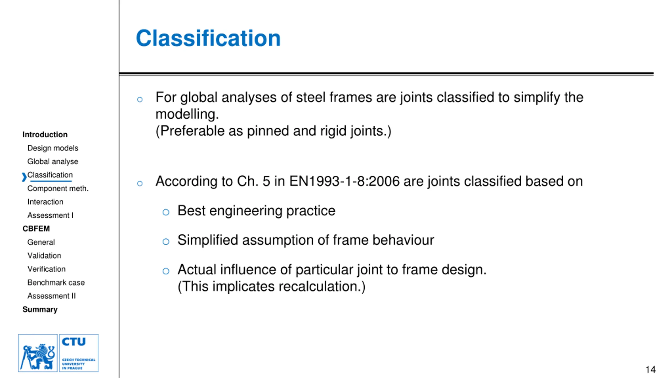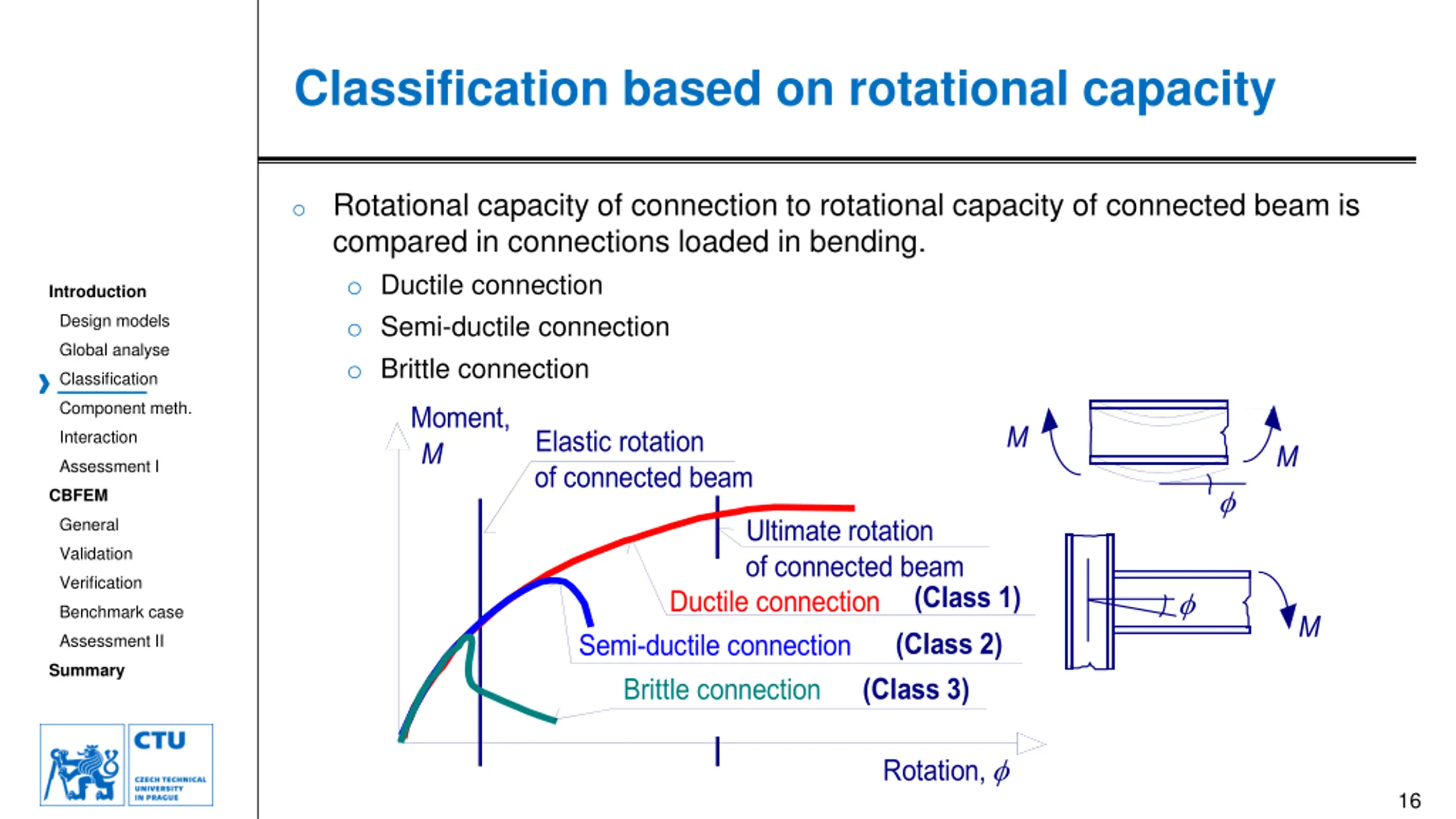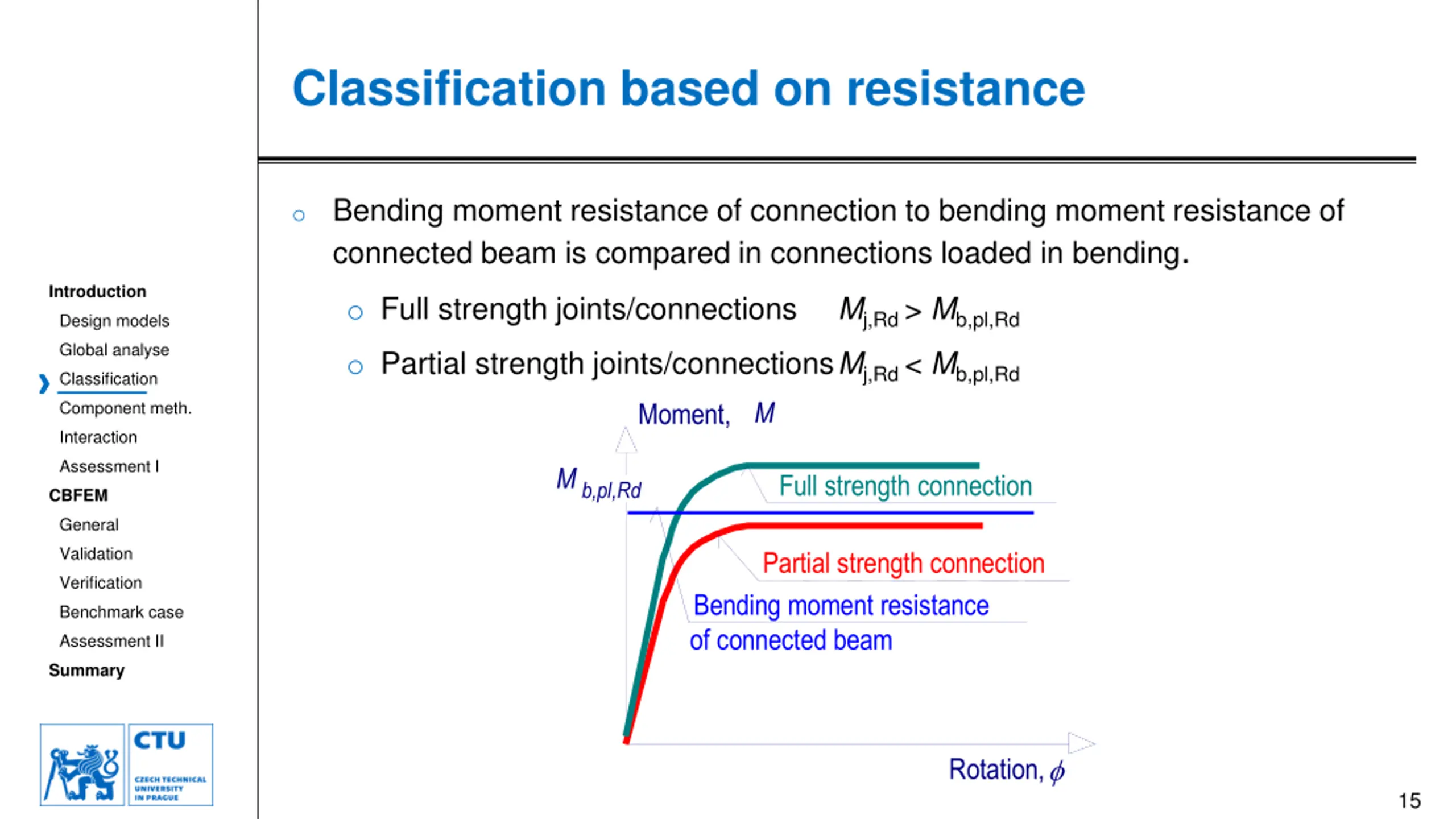 Classification based on resistance o Bending moment resistance of connection to bending moment resistance of connected beam is compared in connections loaded in bending. Introduction o Full strength joints/connections Mj,Rd > Mb,pl,Rd Design models Global analyse o Partial strength joints/connections Mj,Rd < Mb,pl,Rd Moment, Classification M Component meth. Interaction Assessment I Mb,pl,Rd Full strength connection CBFEM General Validation Partial strength connection Bending moment resistance of connected beam Verification Benchmark case Assessment II Summary Rotation, 15