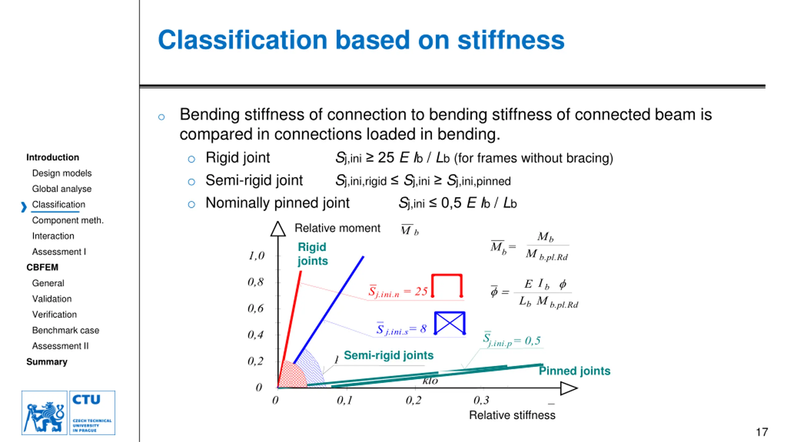 Classification based on rotational capacity o Rotational capacity of connection to rotational capacity of connected beam is compared in connections loaded in bending. o Ductile connection o Semi-ductile connection o Brittle connection Moment, Introduction Design models Global analyse Classification Component meth. M Elastic rotation of connected beam Interaction M M Assessment I CBFEM Ultimate rotation of connected beam General Validation Verification (Class 1) Ductile connection Semi-ductile connection Benchmark case M (Class 2) (Class 3) Assessment II Summary Brittle connection Rotation, 16