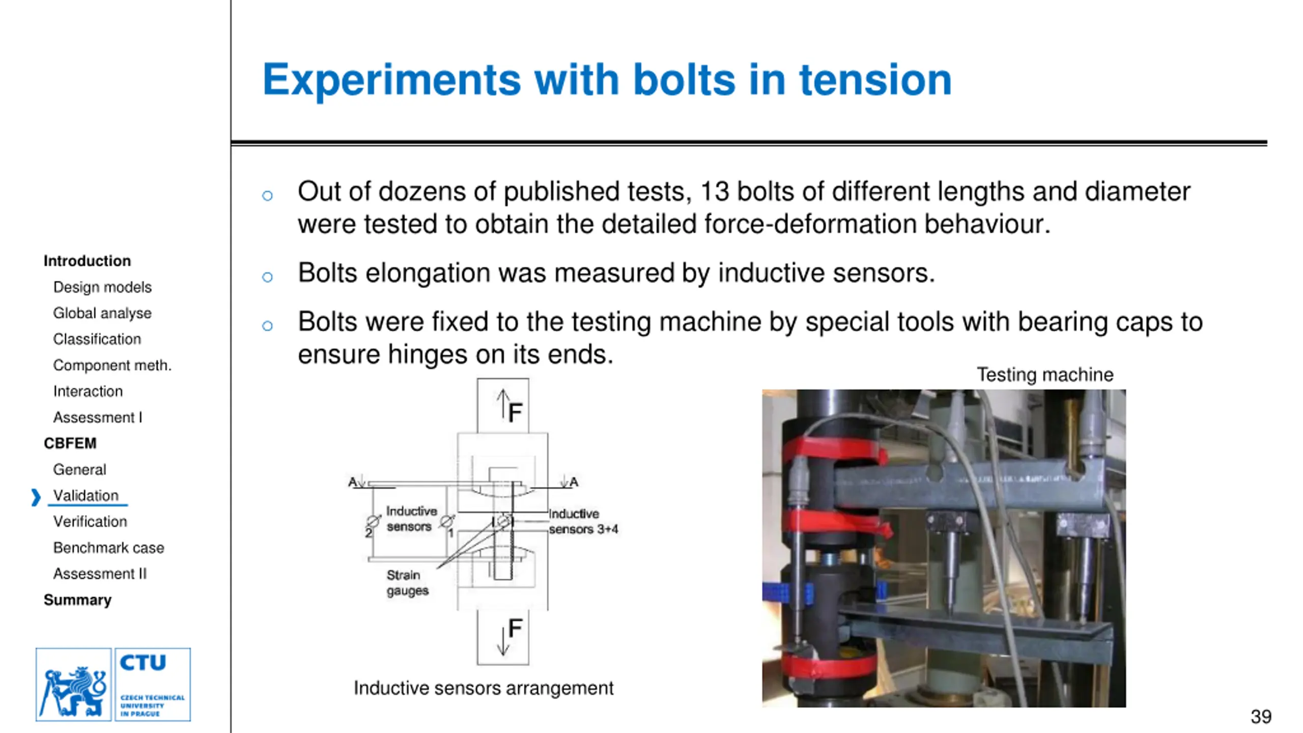 Experiments with bolts in tension o Out of dozens of published tests, 13 bolts of different lengths and diameter were tested to obtain the detailed force-deformation behaviour. Introduction o Bolts elongation was measured by inductive sensors. Design models Global analyse o Bolts were fixed to the testing machine by special tools with bearing caps to ensure hinges on its ends. Classification Component meth. Testing machine Interaction Assessment I CBFEM General Validation Verification Benchmark case Assessment II Summary Inductive sensors arrangement 39