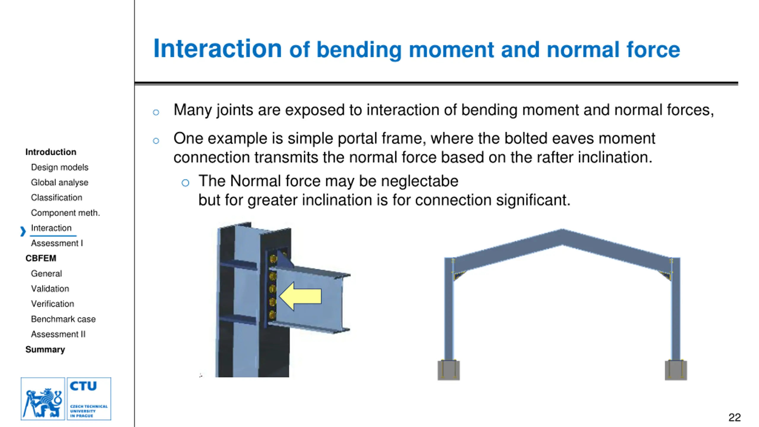 Interaction of bending moment and normal force o Many joints are exposed to interaction of bending moment and normal forces, o One example is simple portal frame, where the bolted eaves moment connection transmits the normal force based on the rafter inclination. o The Normal force may be neglectabe but for greater inclination is for connection significant. Introduction Design models Global analyse Classification Component meth. Interaction Assessment I CBFEM General Validation Verification Benchmark case Assessment II Summary 22