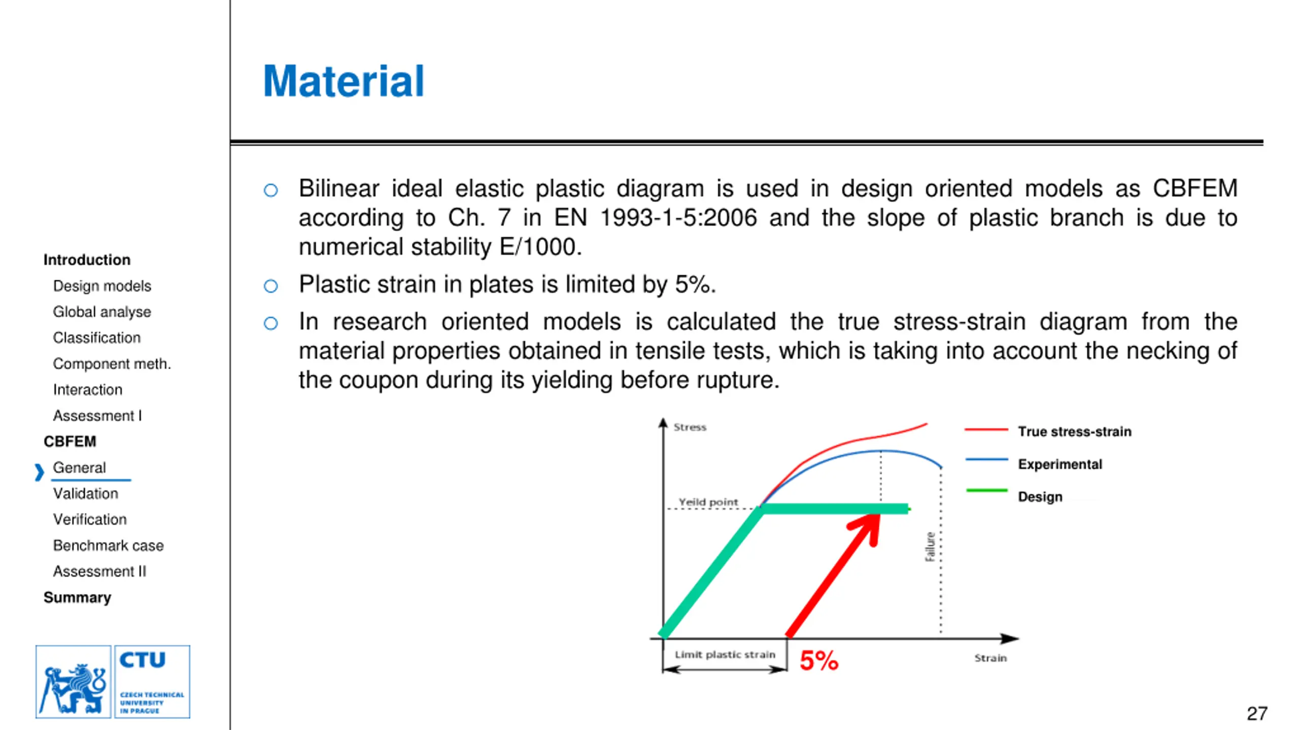 Material o Bilinear ideal elastic plastic diagram is used in design oriented models as CBFEM according to Ch. 7 in EN 1993-1-5:2006 and the slope of plastic branch is due to numerical stability E/1000. o Plastic strain in plates is limited by 5%. o In research oriented models is calculated the true stress-strain diagram from the material properties obtained in tensile tests, which is taking into account the necking of the coupon during its yielding before rupture. Introduction Design models Global analyse Classification Component meth. Interaction Assessment I True stress-strain CBFEM Experimental General Validation Design Verification Benchmark case Assessment II Summary 5% 27