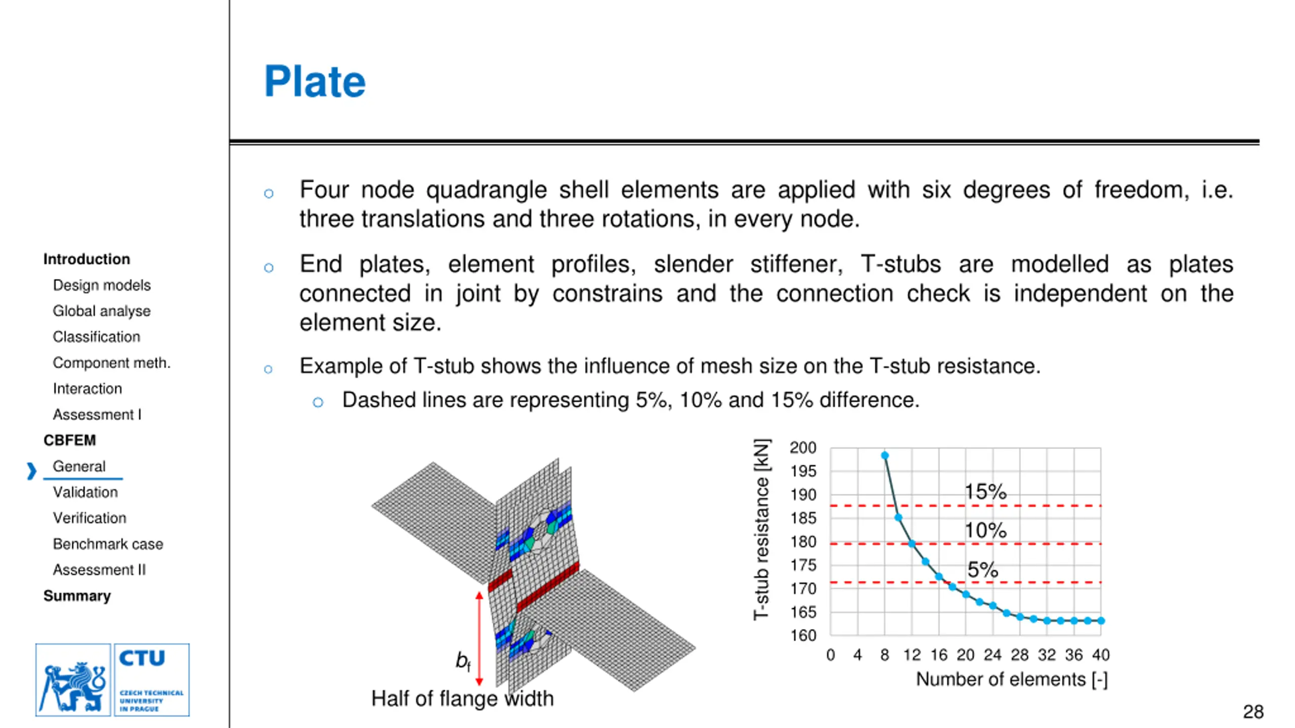 Plate Four node quadrangle shell elements are applied with six degrees of freedom, i.e. three translations and three rotations, in every node. o End plates, element profiles, slender stiffener, T-stubs are modelled as plates connected in joint by constrains and the connection check is independent on the element size. Introduction o Design models Global analyse Classification Example of T-stub shows the influence of mesh size on the T-stub resistance. o Dashed lines are representing 5%, 10% and 15% difference. Component meth. o Interaction Assessment I CBFEM 200 T-stub resistance [kN] General 195 15% Validation 190 185 Verification 10% 180 Benchmark case 175 5% Assessment II 170 Summary 165 160 0 4 8 12 16 20 24 28 32 36 40 Number of elements [-] bf Half of flange width 28