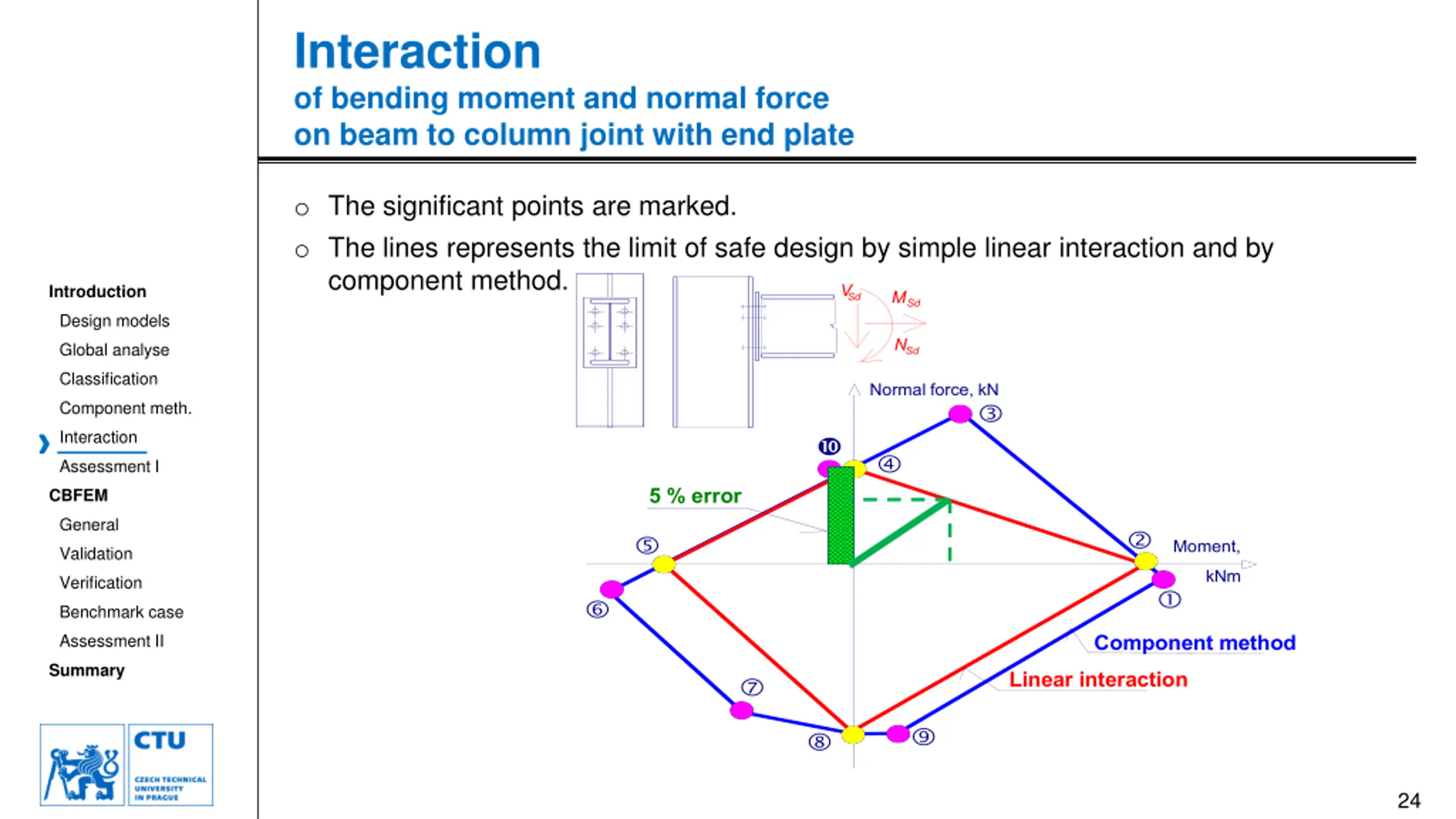 s Interaction of bending moment and normal force on beam to column joint with end plate o The significant points are marked. o The lines represents the limit of safe design by simple linear interaction and by component method. V Introduction M Sd Sd Design models N Global analyse Sd Classification Normal force, kN Component meth. Interaction Assessment I 5 % error CBFEM General Moment, Validation kNm Verification Benchmark case Component method Assessment II Summary Linear interaction 24