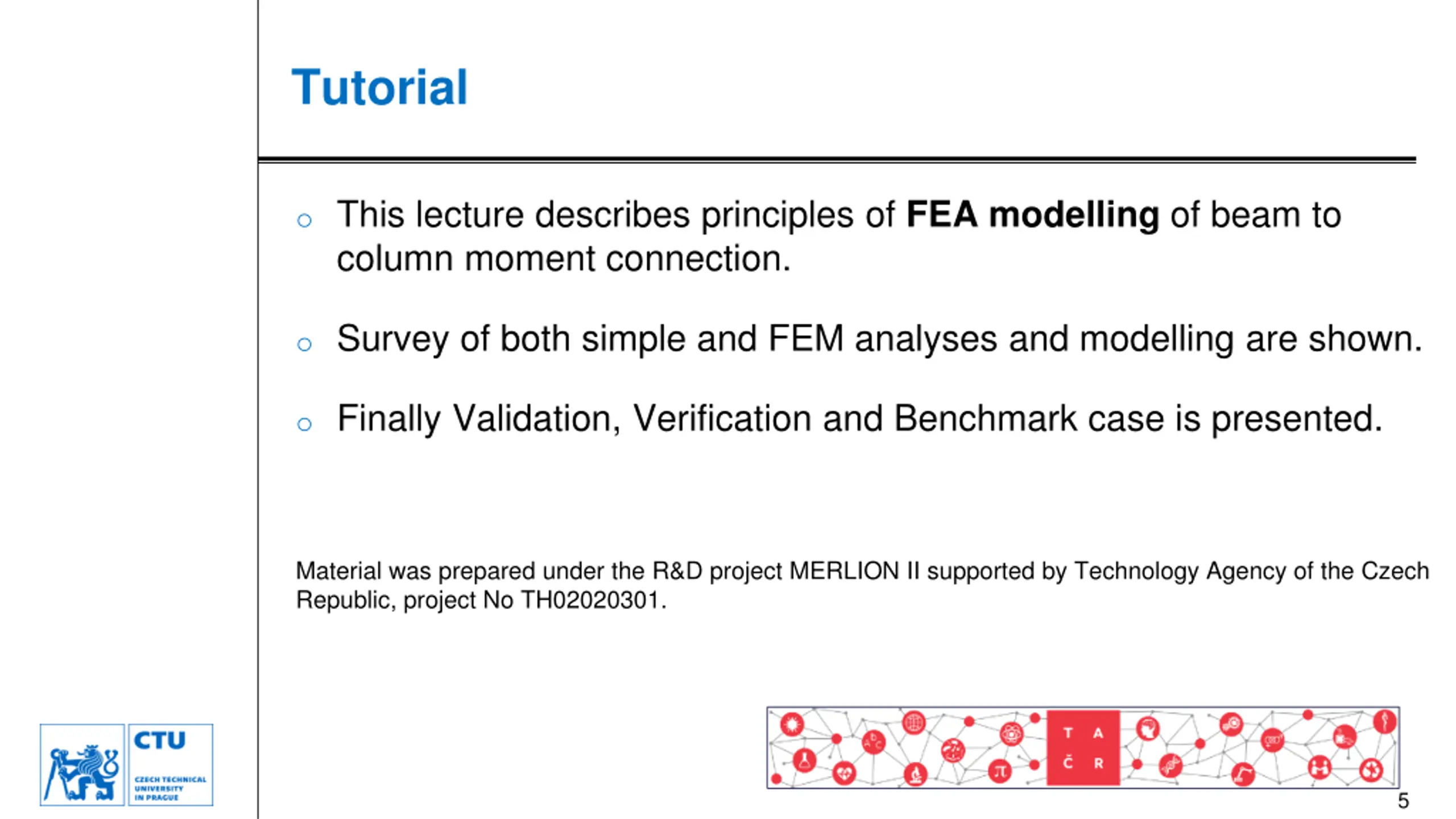 Tutorial o This lecture describes principles of FEA modelling of beam to column moment connection. Introduction Design models o Survey of both simple and FEM analyses and modelling are shown. Global analyse Classification o Finally Validation, Verification and Benchmark case is presented. Component meth. Interaction Assessment I CBFEM General Validation Material was prepared under the R&D project MERLION II supported by Technology Agency of the Czech Republic, project No TH02020301. Verification Benchmark case Assessment II Summary 5