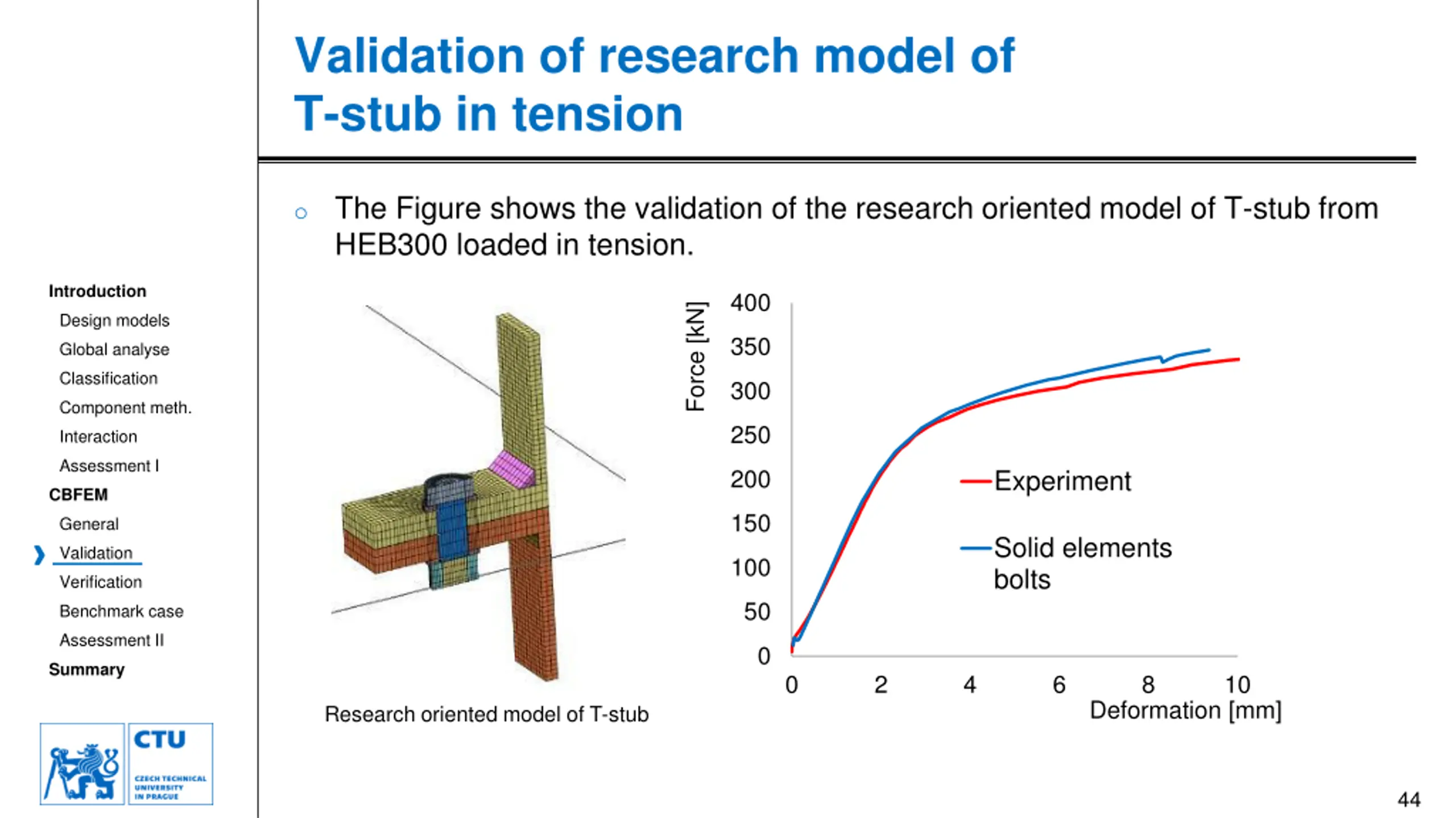 Validation of research model of T-stub in tension o The Figure shows the validation of the research oriented model of T-stub from HEB300 loaded in tension. Introduction 400 Force [kN] Design models 350 Global analyse Classification 300 Component meth. 250 Interaction Assessment I Experiment 200 CBFEM 150 General Solid elements bolts Validation 100 Verification 50 Benchmark case Assessment II 0 Summary 0 2 4 6 8 10 Deformation [mm] Research oriented model of T-stub 44