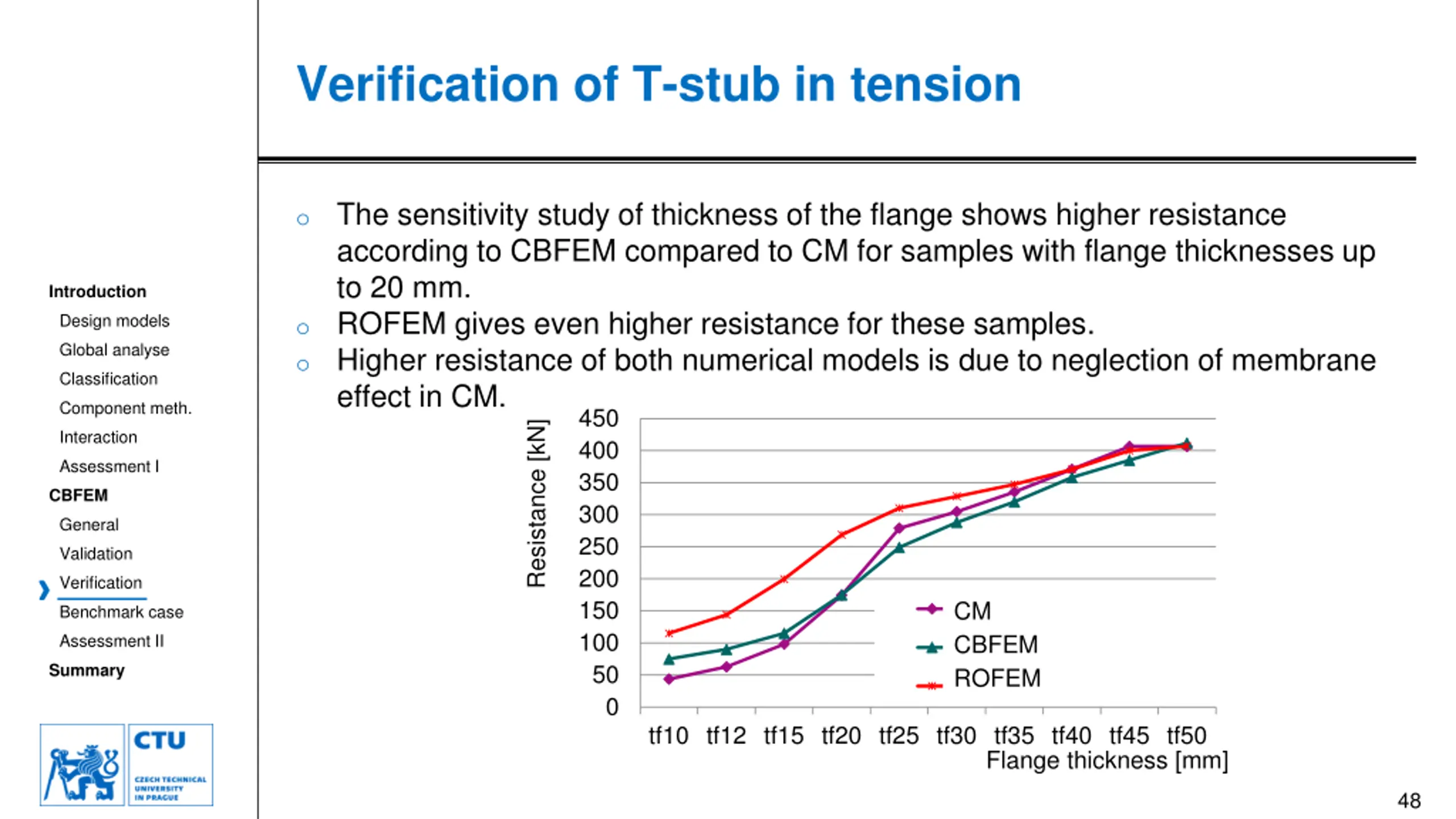 Verification of T-stub in tension o The sensitivity study of thickness of the flange shows higher resistance according to CBFEM compared to CM for samples with flange thicknesses up to 20 mm. o ROFEM gives even higher resistance for these samples. o Higher resistance of both numerical models is due to neglection of membrane effect in CM. 450 Resistance [kN] Introduction Design models Global analyse Classification Component meth. Interaction 400 Assessment I 350 CBFEM 300 General 250 Validation 200 Verification 150 Metoda komponent CM CBFEM ROFEM Benchmark case 100 Assessment II CBFEM 50 Summary Validovan v deck 3D-FEM 0 tf10 tf12 tf15 tf20 tf25 tf30 tf35 tf40 tf45 tf50 Flange thickness [mm] 48