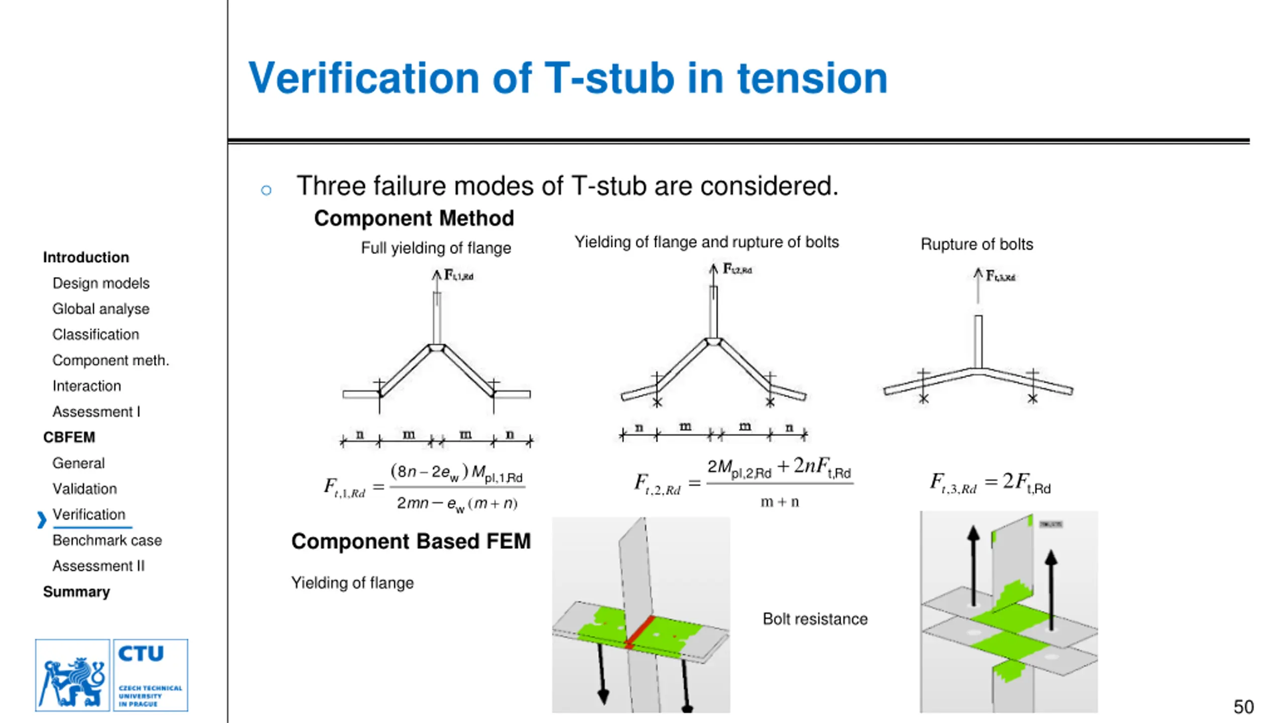 Verification of T-stub in tension o Three failure modes of T-stub are considered. Component Method Yielding of flange and rupture of bolts Rupture of bolts Full yielding of flange Introduction Design models Global analyse Classification Component meth. Interaction Assessment I CBFEM + 2 nF General 2 M ( ) 8 n 2 e M = pl,2, Rd Rd t, = 2 F F F w pl,1, Rd = tF Validation Rd t, , 3 , t Rd , 2 , t Rd , 1 , Rd + m n + 2 mn e m n ( ) w Verification Component Based FEM Benchmark case Assessment II Yielding of flange Summary Bolt resistance 50