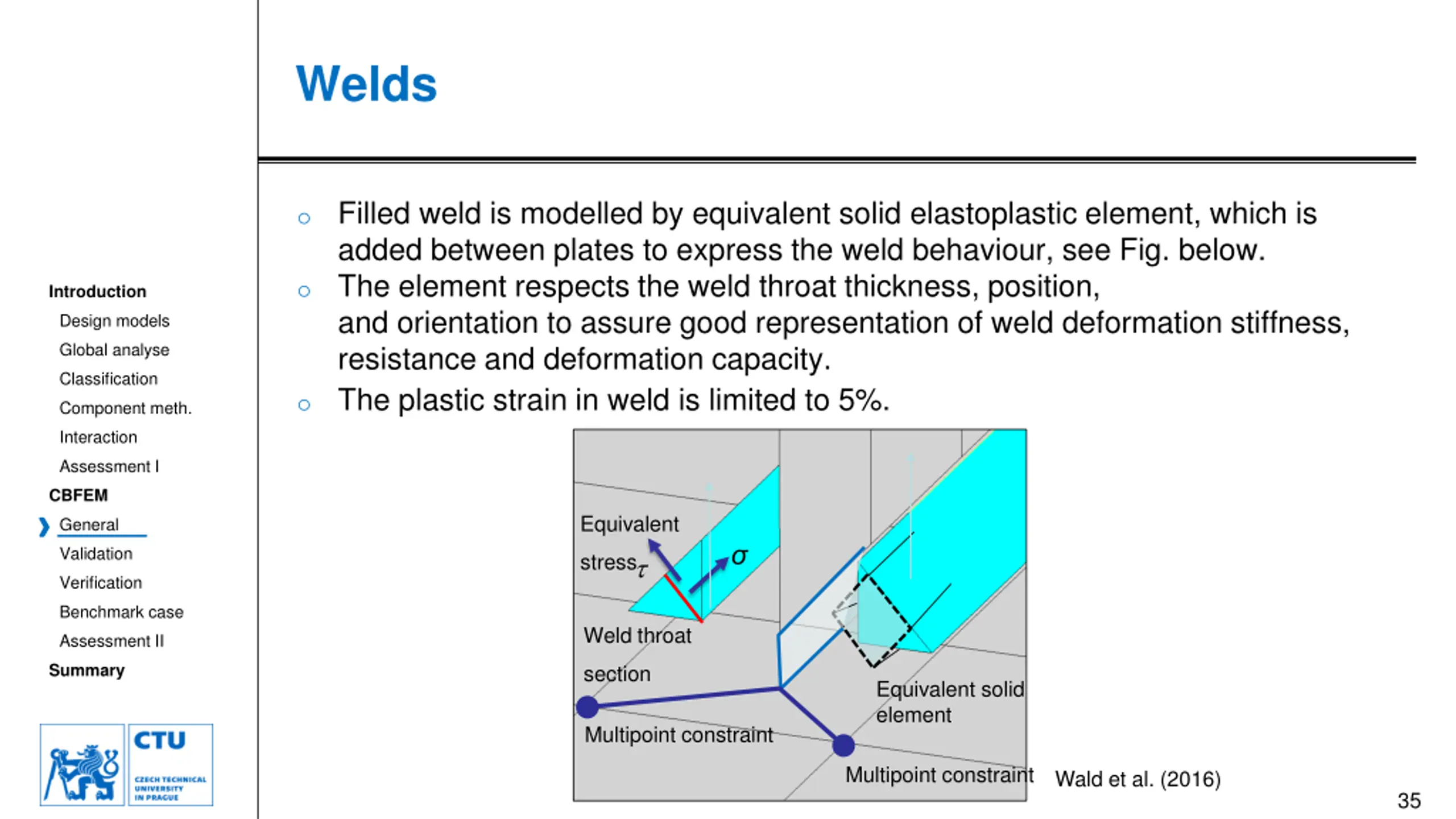 Welds o Filled weld is modelled by equivalent solid elastoplastic element, which is added between plates to express the weld behaviour, see Fig. below. o The element respects the weld throat thickness, position, and orientation to assure good representation of weld deformation stiffness, resistance and deformation capacity. o The plastic strain in weld is limited to 5%. Introduction Design models Global analyse Classification Component meth. Interaction Assessment I CBFEM Equivalent General Validation stress Verification Benchmark case Weld throat Assessment II Summary section Equivalent solid element Multipoint constraint Multipoint constraint Wald et al. (2016) 35