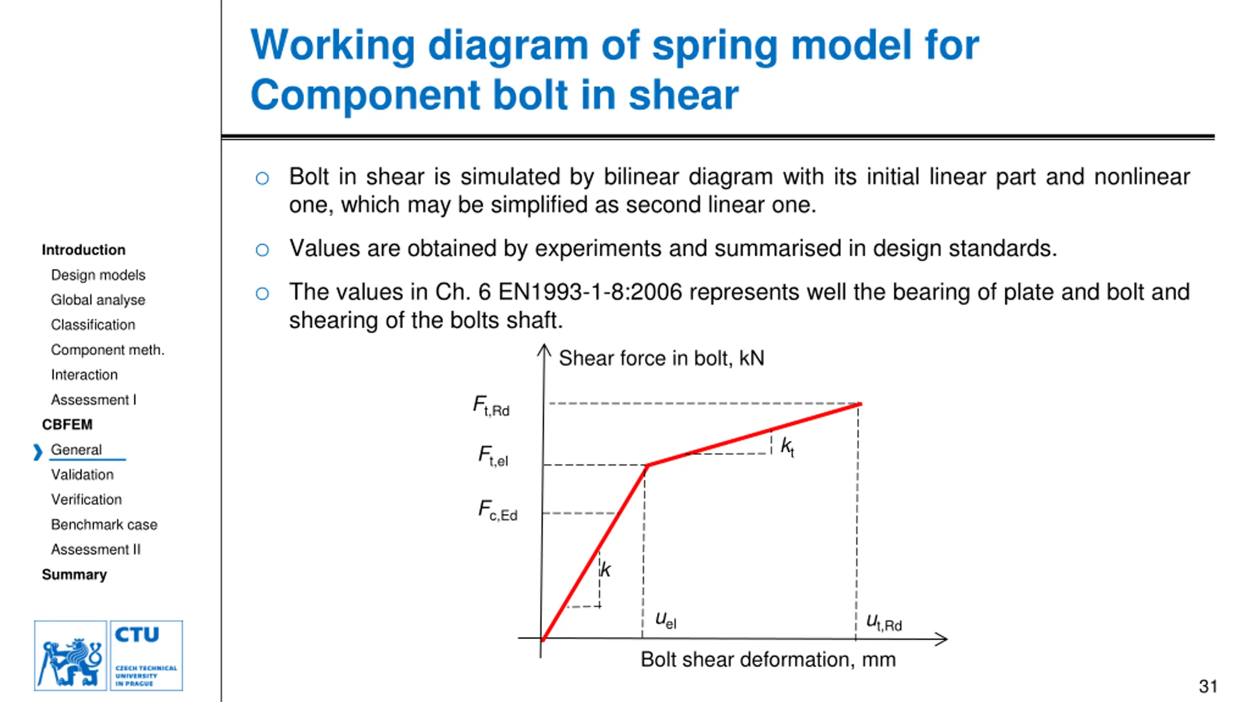 Working diagram of spring model for Component bolt in tension o For bolt s resistance is expected maximum allowed plastic strain mpb as 25 % of elongation to fracture of bolt according to EN ISO 898- 1:2013, the values are summarised in Table below. o The stiffness in tension is calculated as k = E As/Lb, where As is tensile area of bolt and Lb is the distance between the centers of the head and the bolt nut. Tensile force in bolt, kN Ft,Rd Introduction Design models kt Global analyse Ft,el Classification Component meth. Fc,Ed Interaction Assessment I CBFEM k General Validation uel ut,Rd Verification Benchmark case Bolt tesile deformation, mm Assessment II Maximum allowed plastic strains for bolts t,Rd Bolt grade 4.8 5.6 Summary 5.8 6.8 8.8 10.9 mpb % 3,5 5,0 2,5 2,0 3,0 2,3 30