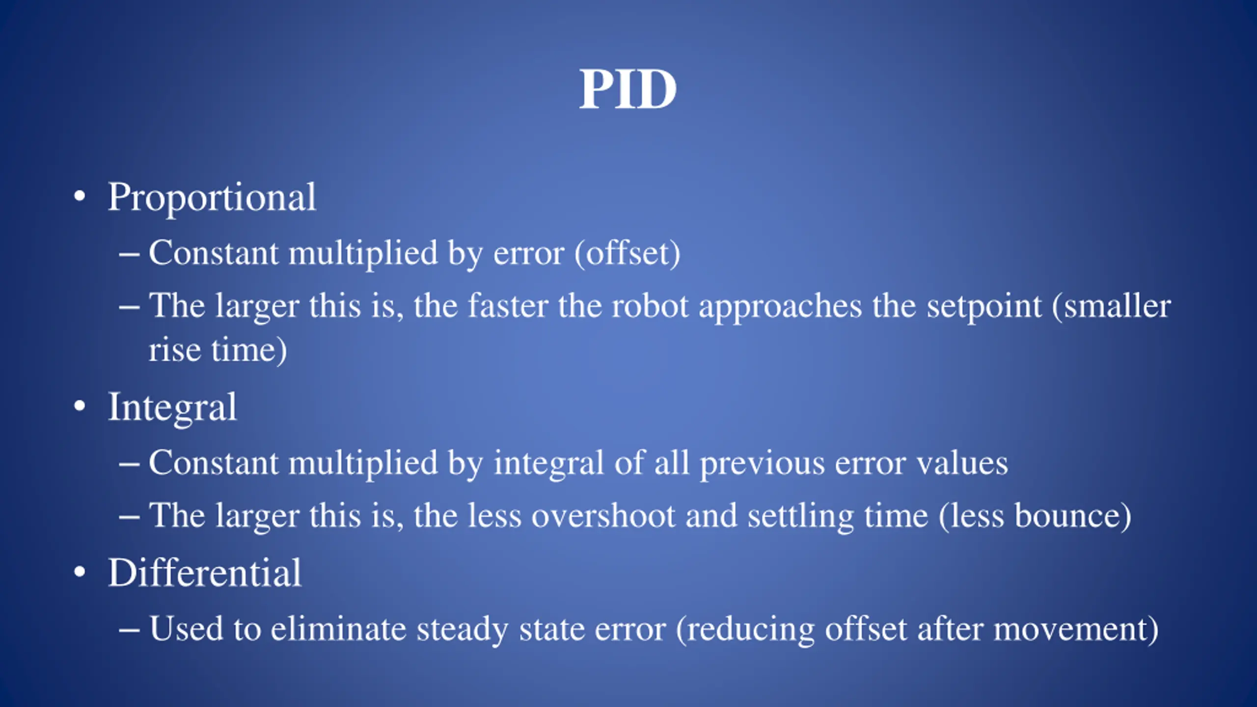 PID Proportional Constant multiplied by error (offset) The larger this is, the faster the robot approaches the setpoint (smaller rise time) Integral Constant multiplied by integral of all previous error values The larger this is, the less overshoot and settling time (less bounce) Differential Used to eliminate steady state error (reducing offset after movement)