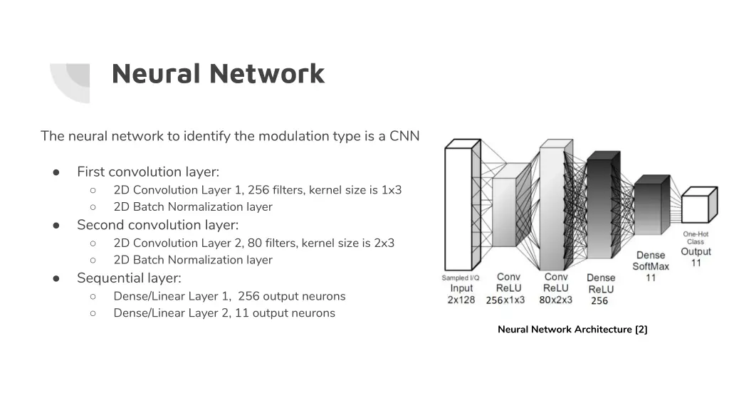 Neural Network The neural network to identify the modulation type is a CNN First convolution layer: 2D Convolution Layer 1, 256 filters, kernel size is 1x3 2D Batch Normalization layer Second convolution layer: 2D Convolution Layer 2, 80 filters, kernel size is 2x3 2D Batch Normalization layer Sequential layer: Dense/Linear Layer 1, 256 output neurons Dense/Linear Layer 2, 11 output neurons Neural Network Architecture [2]