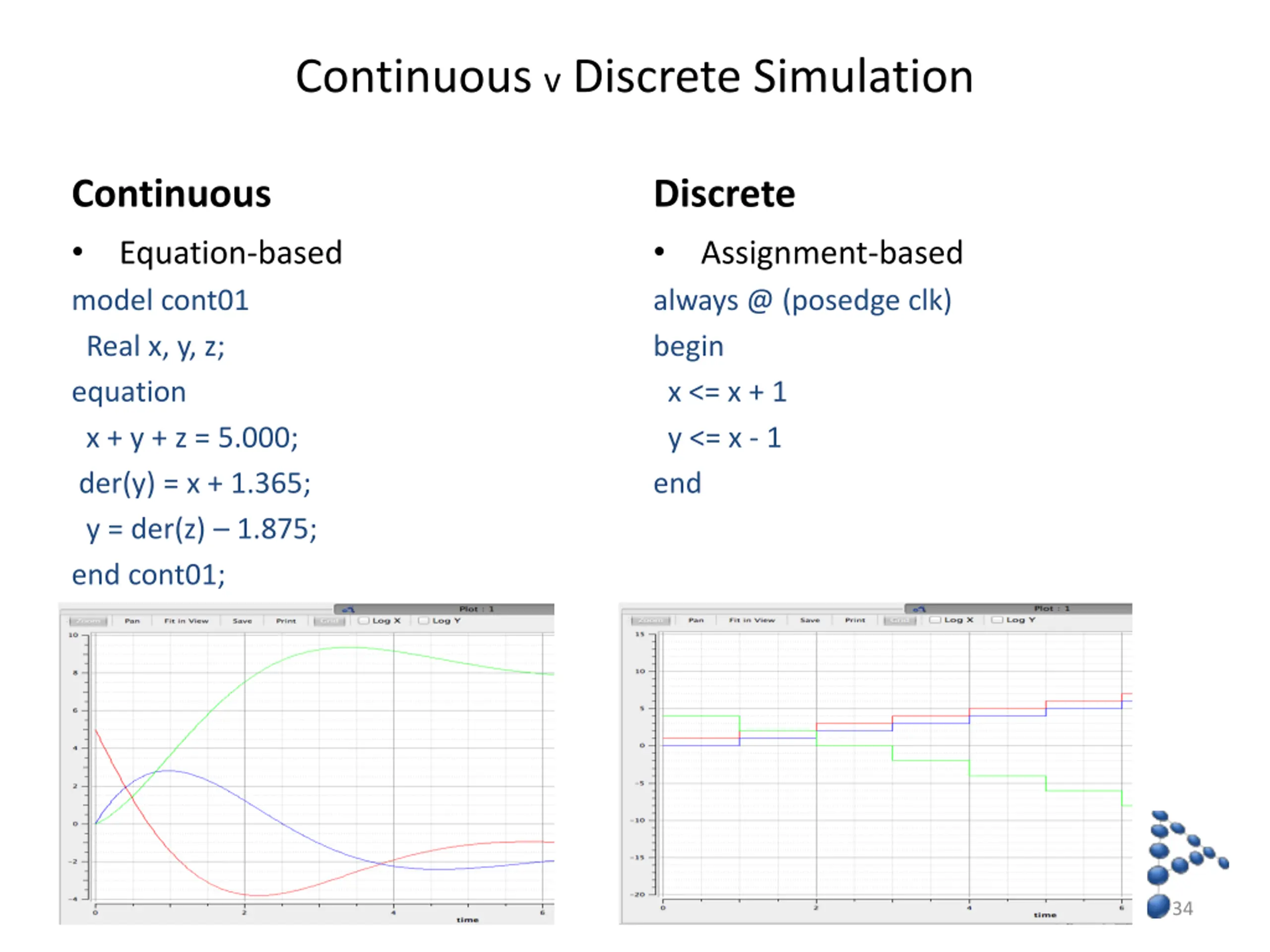 Continuous v Discrete Simulation Continuous Equation-based model cont01 Real x, y, z; equation x + y + z = 5.000; der(y) = x + 1.365; y = der(z) 1.875; end cont01; Discrete Assignment-based always @ (posedge clk) begin x <= x + 1 y <= x - 1 end 34
