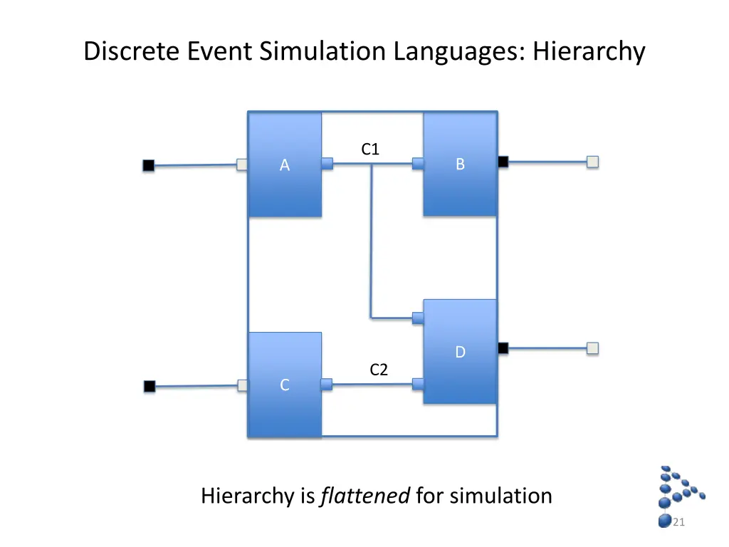 Discrete Event Simulation Languages: Hierarchy C1 B A D C2 C Hierarchy is flattened for simulation 21