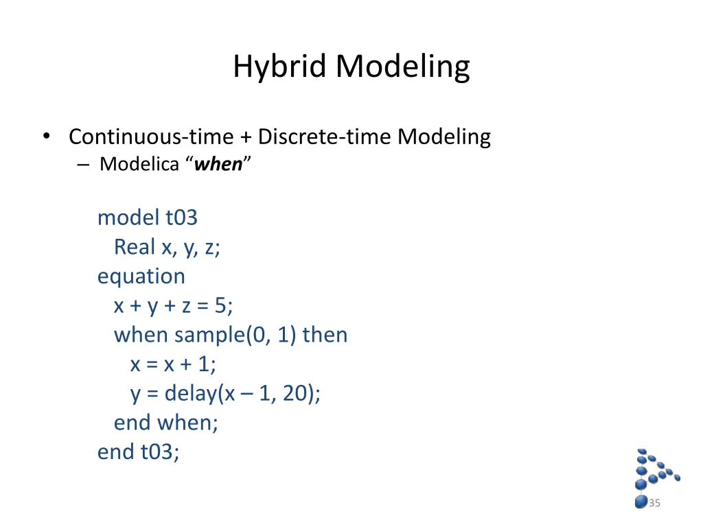 Hybrid Modeling Continuous-time + Discrete-time Modeling Modelica when model t03 Real x, y, z; equation x + y + z = 5; when sample(0, 1) then x = x + 1; y = delay(x 1, 20); end when; end t03; 35