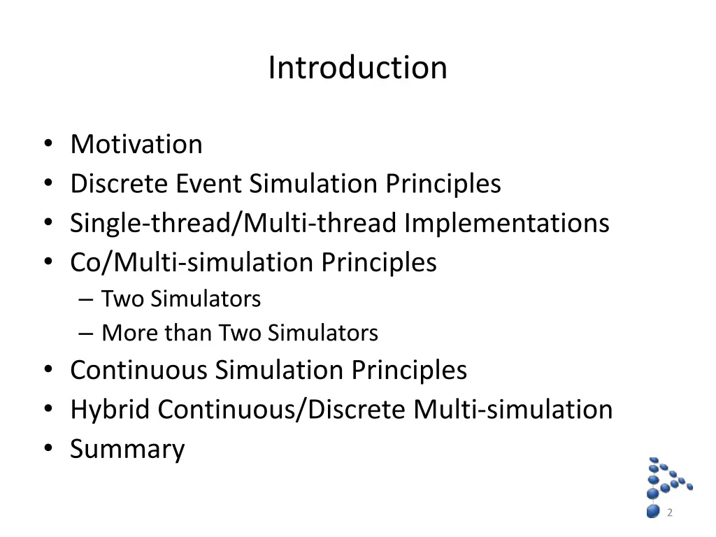 Introduction Motivation Discrete Event Simulation Principles Single-thread/Multi-thread Implementations Co/Multi-simulation Principles Two Simulators More than Two Simulators Continuous Simulation Principles Hybrid Continuous/Discrete Multi-simulation Summary 2