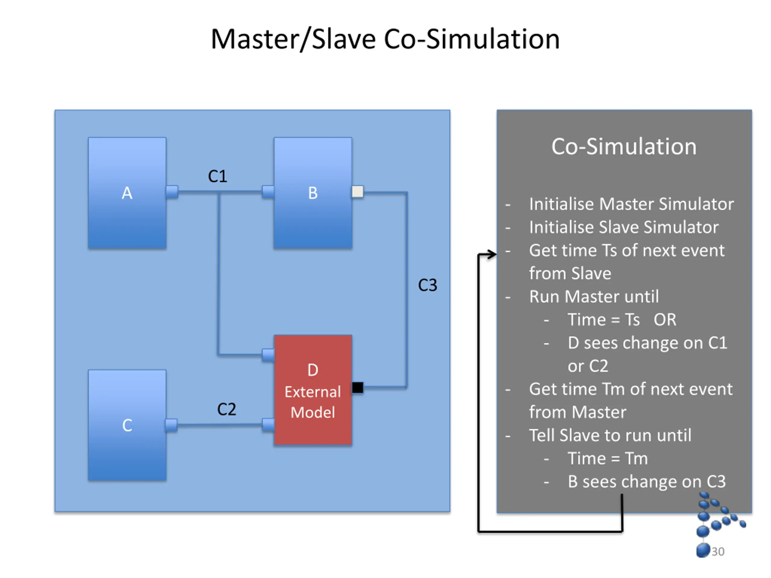 Master/Slave Co-Simulation Master Simulator C1 - - Master Event Queue Design Topology - Components - Connectors Initiates the Slave and establishes Inter-Process Communication A B - C3 D External Model Slave Simulator C2 C - - Slave Event Queue Slave Component 29