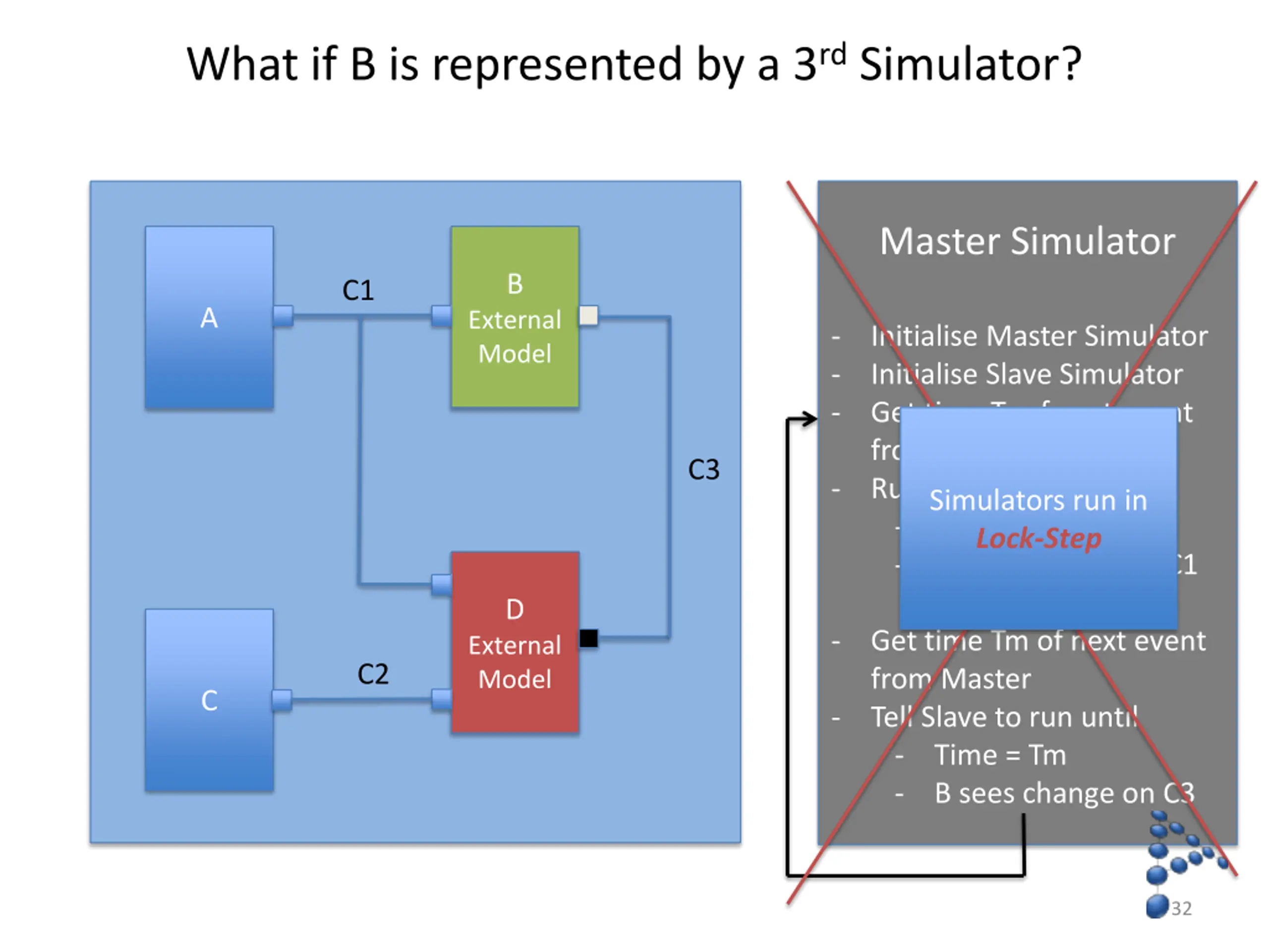 What if B is represented by a 3rd Simulator? Master Simulator B C1 A External Model - - - Initialise Master Simulator Initialise Slave Simulator Get time Ts of next event from Slave Run Master until - Time = Ts OR - D sees change on C1 or C2 Get time Tm of next event from Master Tell Slave to run until - Time = Tm - B sees change on C3 C3 - D - External Model C2 C - 31