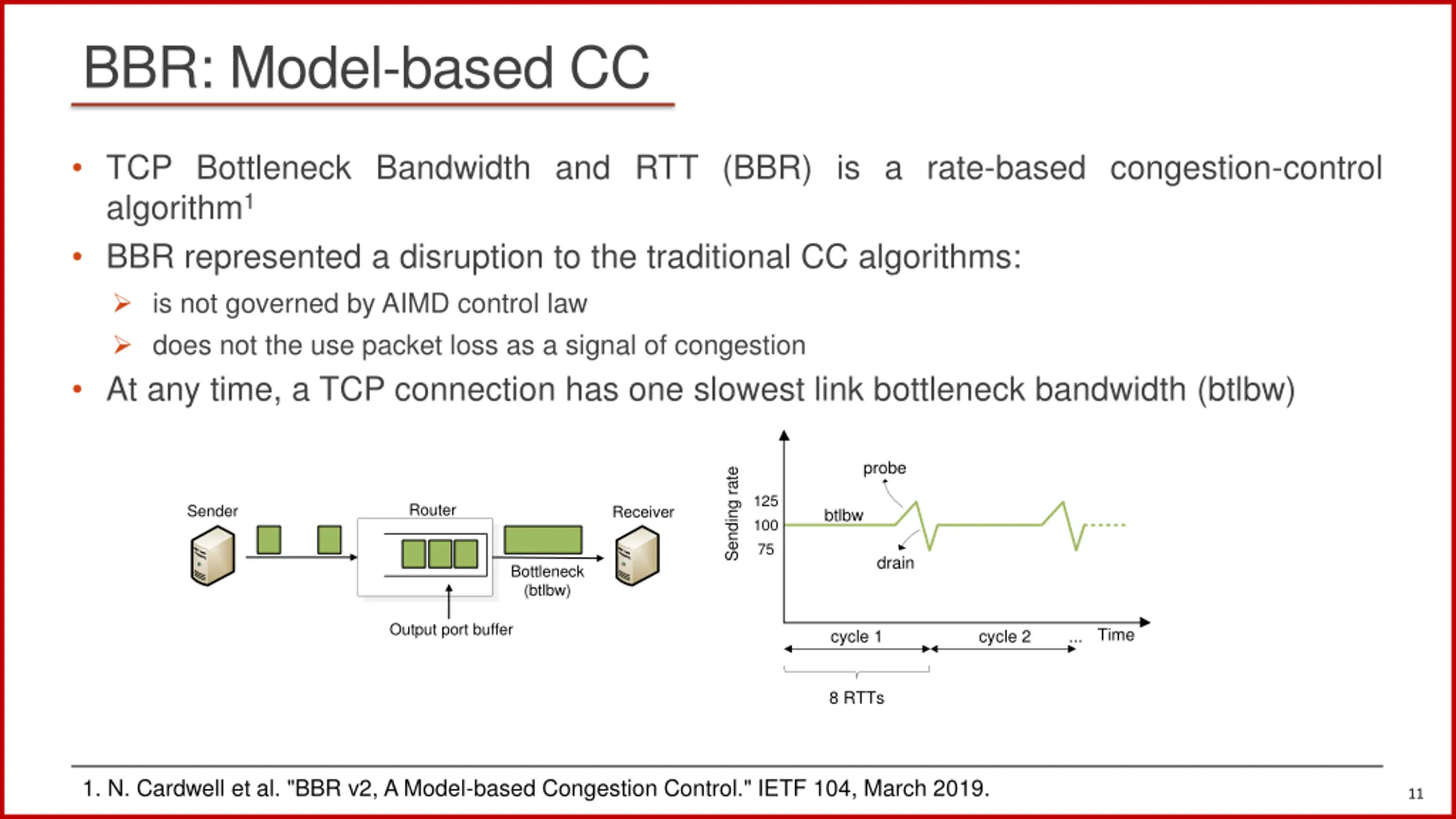 BBR: Model-based CC TCP Bottleneck Bandwidth and RTT (BBR) is a rate-based congestion-control algorithm1 BBR represented a disruption to the traditional CC algorithms: is not governed by AIMD control law does not the use packet loss as a signal of congestion At any time, a TCP connection has one slowest link bottleneck bandwidth (btlbw) probe Sending rate 125 Router Sender Receiver btlbw 100 75 drain Bottleneck (btlbw) Output port buffer Time cycle 1 cycle 2 ... 8 RTTs 1. N. Cardwell et al. "BBR v2, A Model-based Congestion Control." IETF 104, March 2019. 11