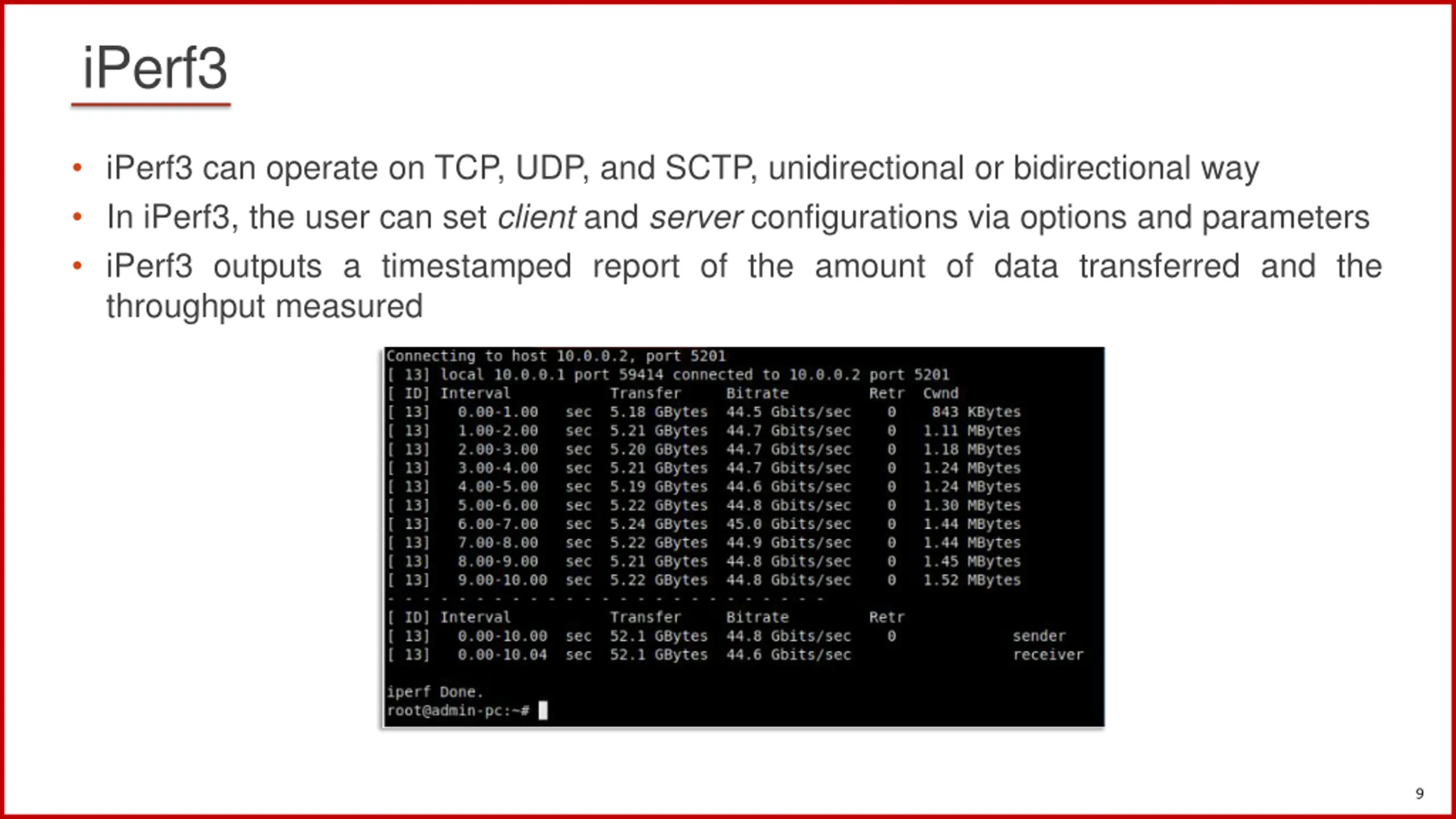 iPerf3 iPerf3 can operate on TCP, UDP, and SCTP, unidirectional or bidirectional way In iPerf3, the user can set client and server configurations via options and parameters iPerf3 outputs a timestamped report of the amount of data transferred and the throughput measured 9