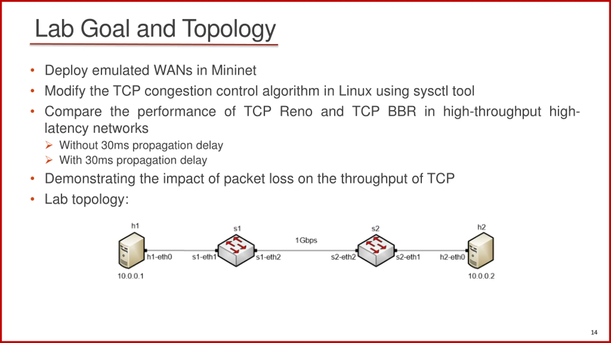 Lab Goal and Topology Deploy emulated WANs in Mininet Modify the TCP congestion control algorithm in Linux using sysctl tool Compare the performance of TCP Reno and TCP BBR in high-throughput high- latency networks Without 30ms propagation delay With 30ms propagation delay Demonstrating the impact of packet loss on the throughput of TCP Lab topology: 14