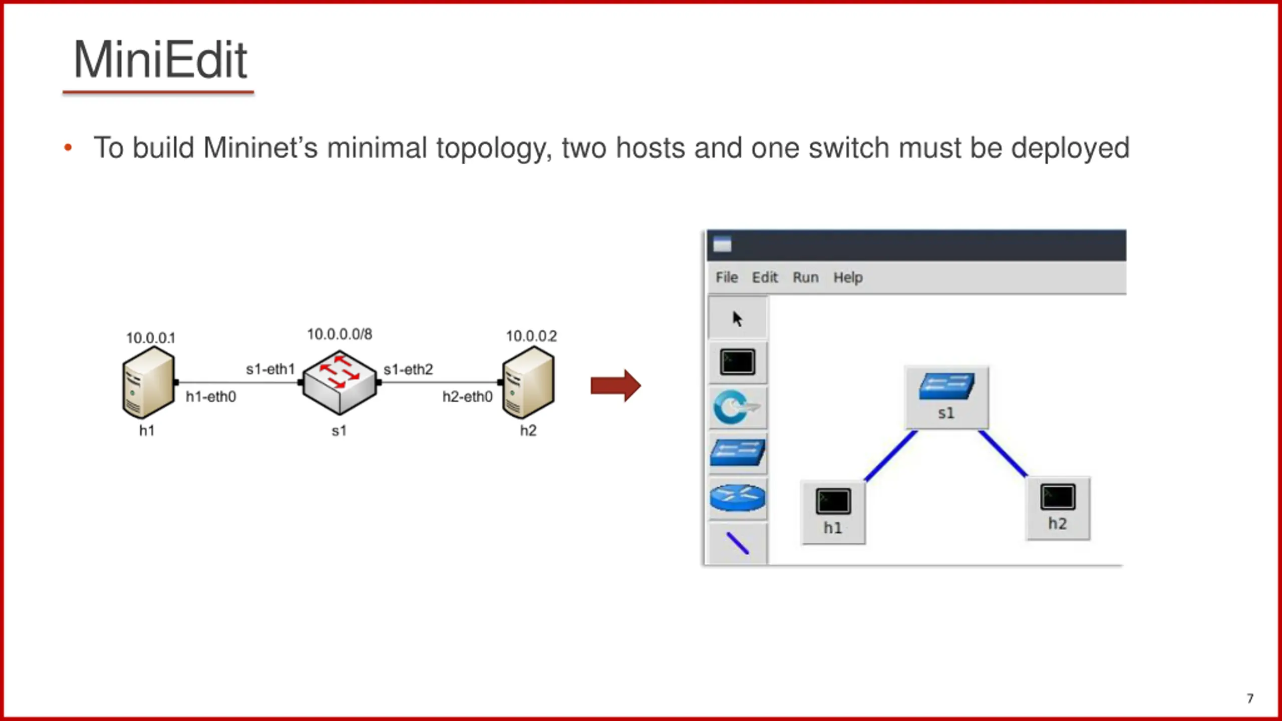 MiniEdit To build Mininet s minimal topology, two hosts and one switch must be deployed 7