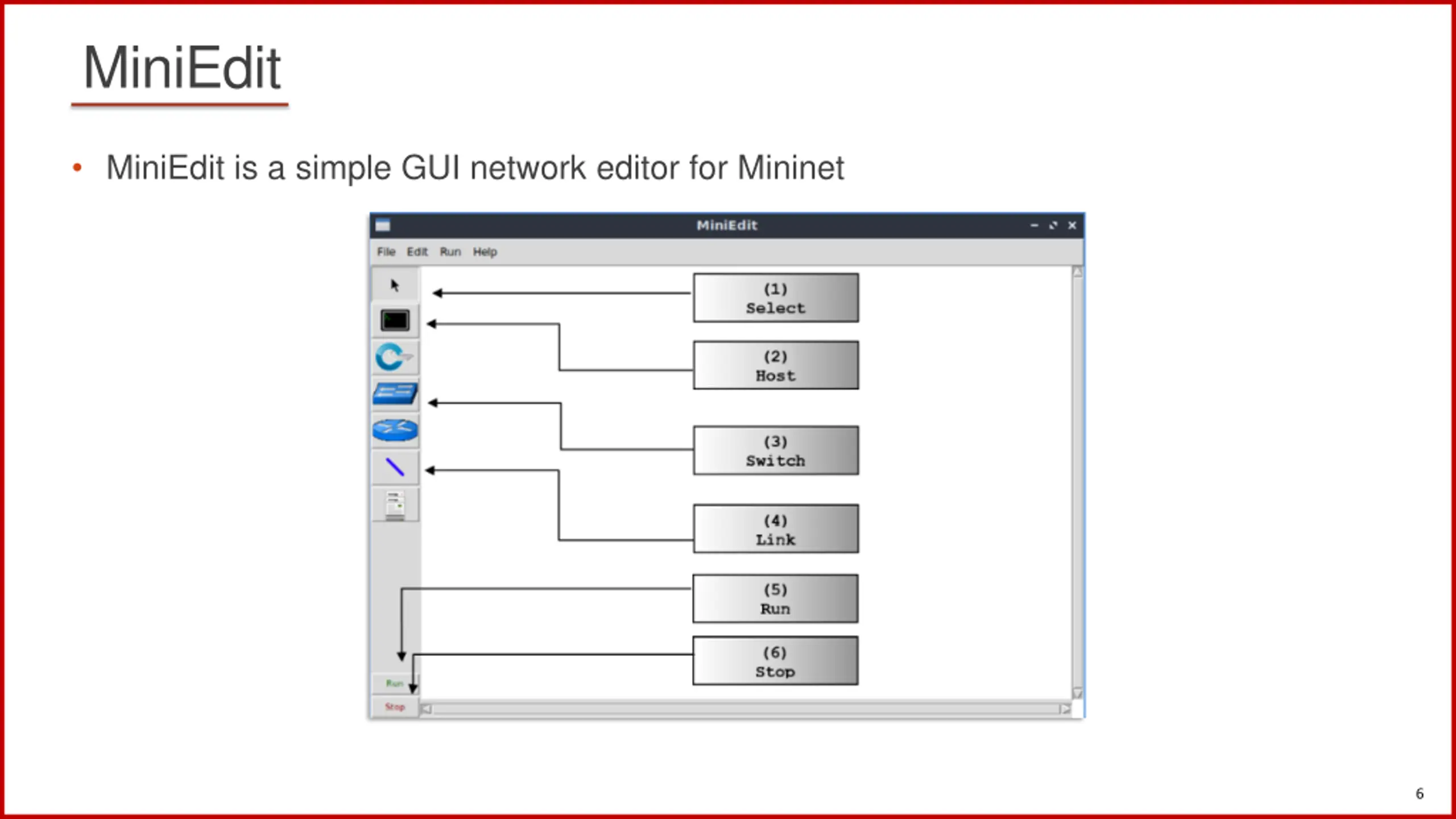 MiniEdit MiniEdit is a simple GUI network editor for Mininet 6