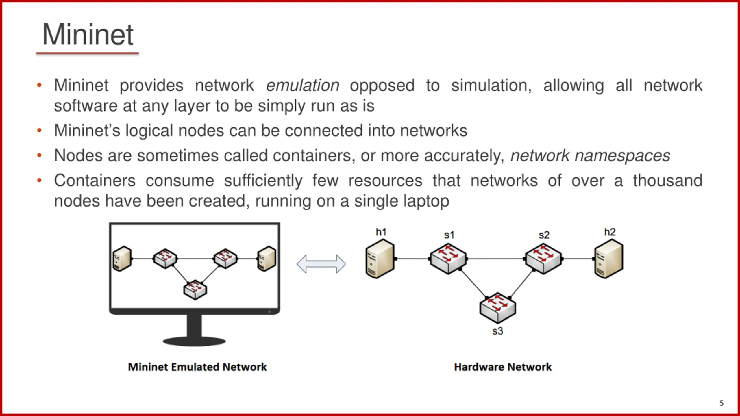 Mininet Mininet provides network emulation opposed to simulation, allowing all network software at any layer to be simply run as is Mininet s logical nodes can be connected into networks Nodes are sometimes called containers, or more accurately, network namespaces Containers consume sufficiently few resources that networks of over a thousand nodes have been created, running on a single laptop 5
