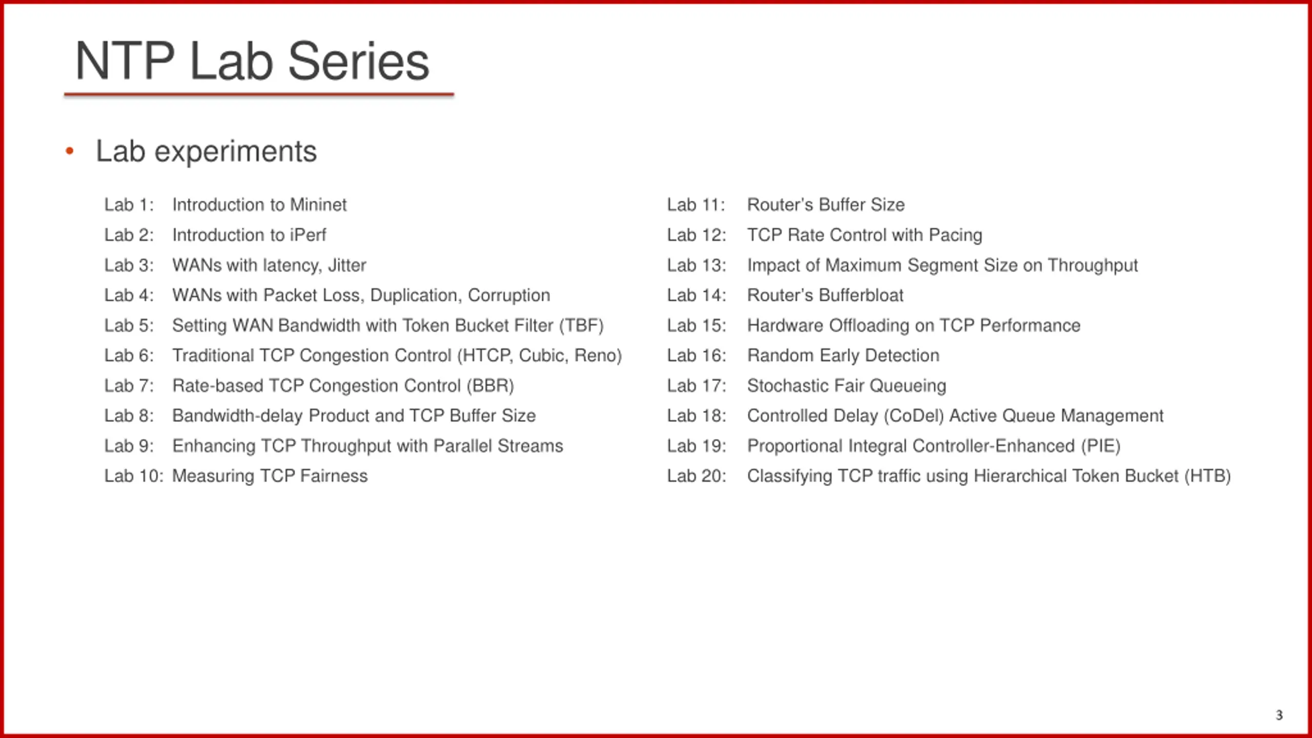 NTP Lab Series Lab experiments Lab 1: Introduction to Mininet Lab 11: Router s Buffer Size Lab 2: Introduction to iPerf Lab 12: TCP Rate Control with Pacing Lab 3: WANs with latency, Jitter Lab 13: Impact of Maximum Segment Size on Throughput Lab 4: WANs with Packet Loss, Duplication, Corruption Lab 14: Router s Bufferbloat Lab 5: Setting WAN Bandwidth with Token Bucket Filter (TBF) Lab 15: Hardware Offloading on TCP Performance Lab 6: Traditional TCP Congestion Control (HTCP, Cubic, Reno) Lab 16: Random Early Detection Lab 7: Rate-based TCP Congestion Control (BBR) Lab 17: Stochastic Fair Queueing Lab 8: Bandwidth-delay Product and TCP Buffer Size Lab 18: Controlled Delay (CoDel) Active Queue Management Lab 9: Enhancing TCP Throughput with Parallel Streams Lab 19: Proportional Integral Controller-Enhanced (PIE) Lab 10: Measuring TCP Fairness Lab 20: Classifying TCP traffic using Hierarchical Token Bucket (HTB) 3