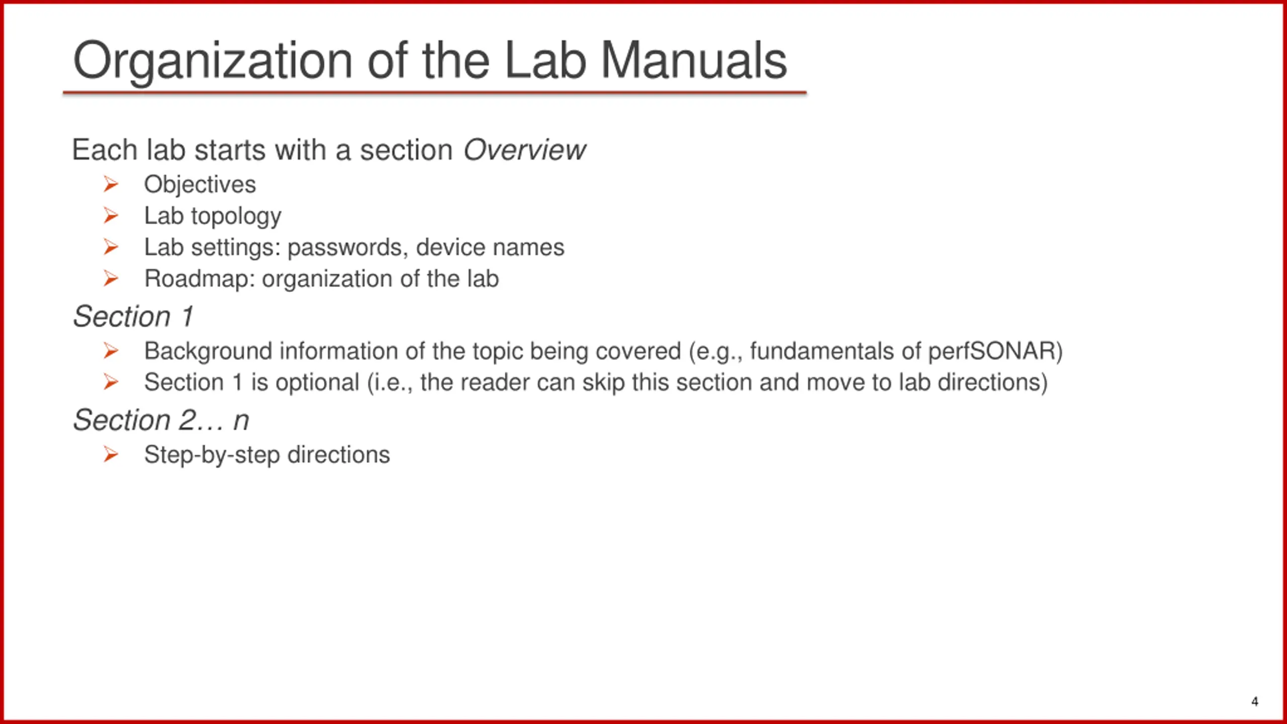 Organization of the Lab Manuals Each lab starts with a section Overview Objectives Lab topology Lab settings: passwords, device names Roadmap: organization of the lab Section 1 Background information of the topic being covered (e.g., fundamentals of perfSONAR) Section 1 is optional (i.e., the reader can skip this section and move to lab directions) Section 2 n Step-by-step directions 4