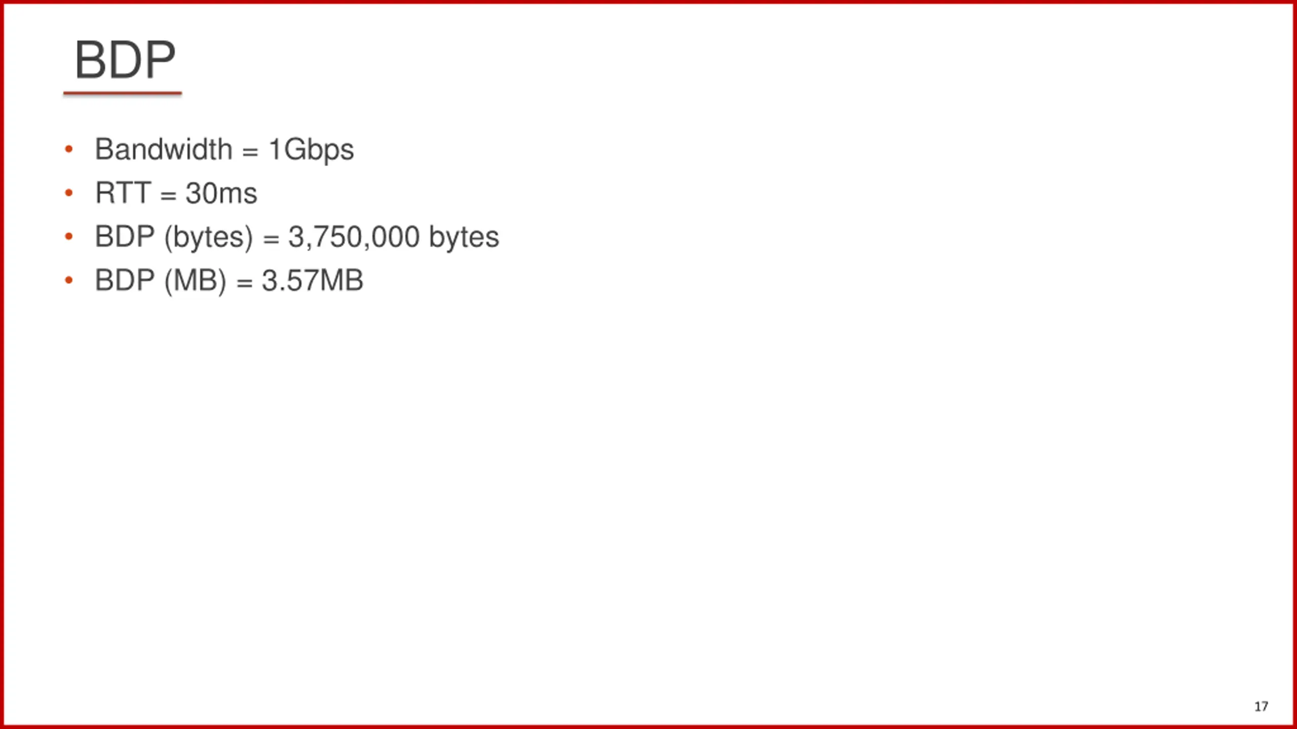 BDP Bandwidth = 1Gbps RTT = 30ms BDP (bytes) = 3,750,000 bytes BDP (MB) = 3.57MB 17