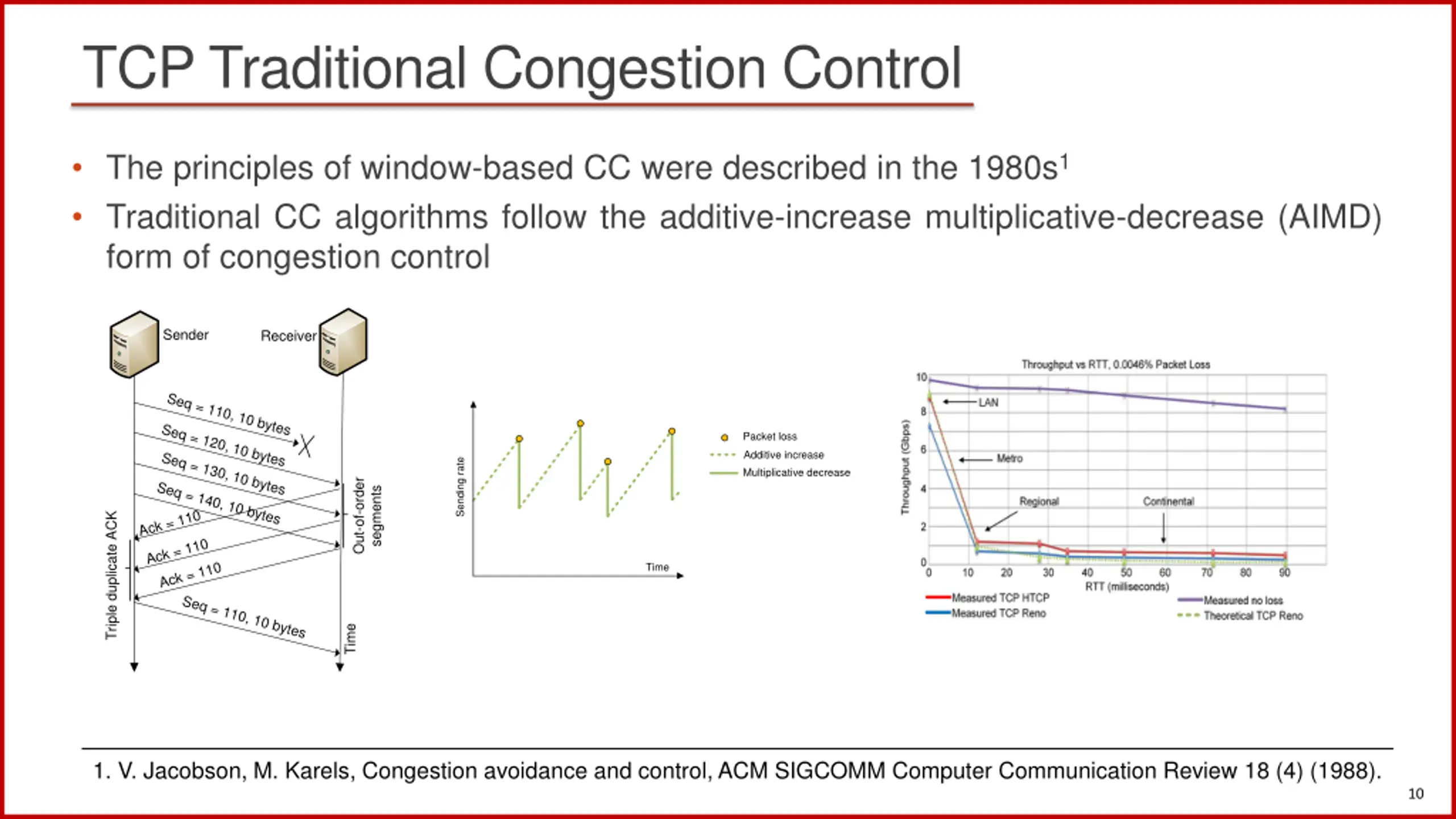 TCP Traditional Congestion Control The principles of window-based CC were described in the 1980s1 Traditional CC algorithms follow the additive-increase multiplicative-decrease (AIMD) form of congestion control Sender Receiver Seq = 110, 10 bytes Seq = 120, 10 bytes Seq = 130, 10 bytes Seq = 140, 10 bytes Ack = 110 Packet loss Additive increase Multiplicative decrease Sending rate Out-of-order segments Triple duplicate ACK Ack = 110 Ack = 110 Time Seq = 110, 10 bytes Time 1. V. Jacobson, M. Karels, Congestion avoidance and control, ACM SIGCOMM Computer Communication Review 18 (4) (1988). 10