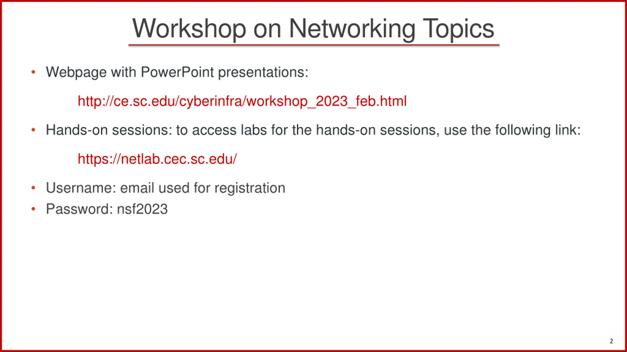 Workshop on Networking Topics Webpage with PowerPoint presentations: http://ce.sc.edu/cyberinfra/workshop_2023_feb.html Hands-on sessions: to access labs for the hands-on sessions, use the following link: https://netlab.cec.sc.edu/ Username: email used for registration Password: nsf2023 2