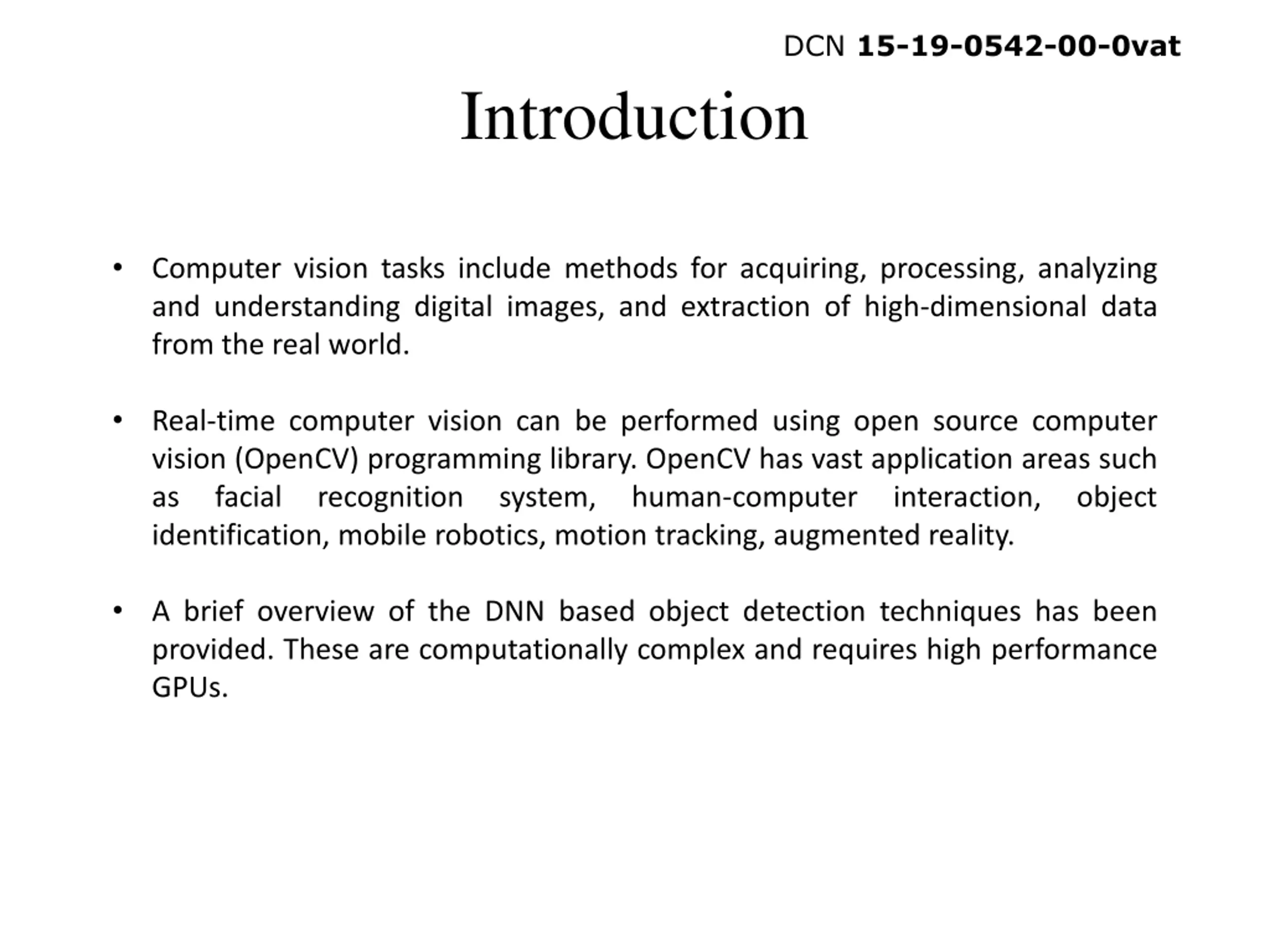 DCN 15-19-0542-00-0vat Introduction Computer vision tasks include methods for acquiring, processing, analyzing and understanding digital images, and extraction of high-dimensional data from the real world. Real-time computer vision can be performed using open source computer vision (OpenCV) programming library. OpenCV has vast application areas such as facial recognition system, human-computer interaction, object identification, mobile robotics, motion tracking, augmented reality. A brief overview of the DNN based object detection techniques has been provided. These are computationally complex and requires high performance GPUs.